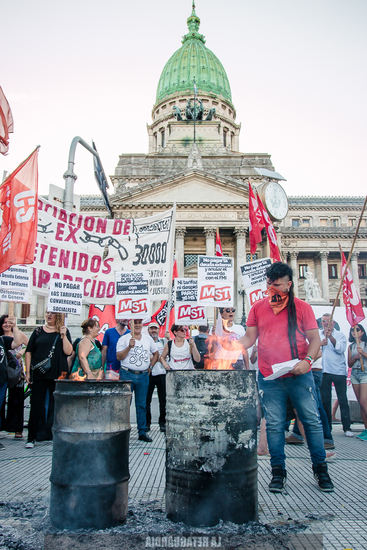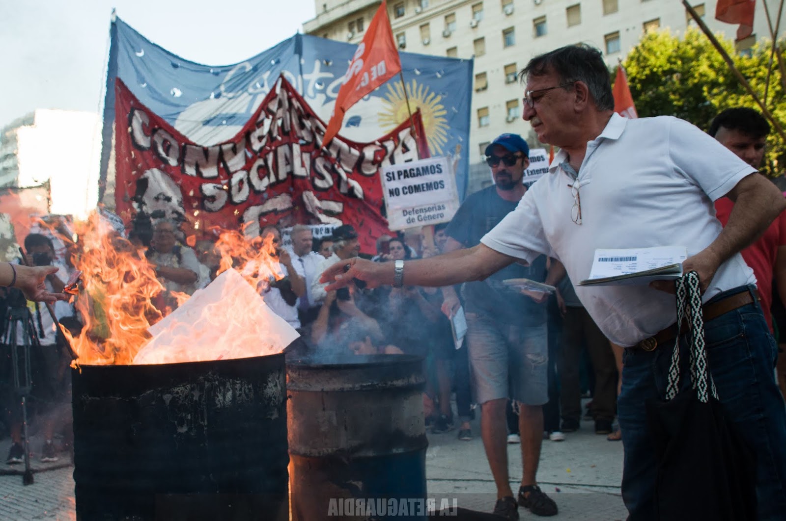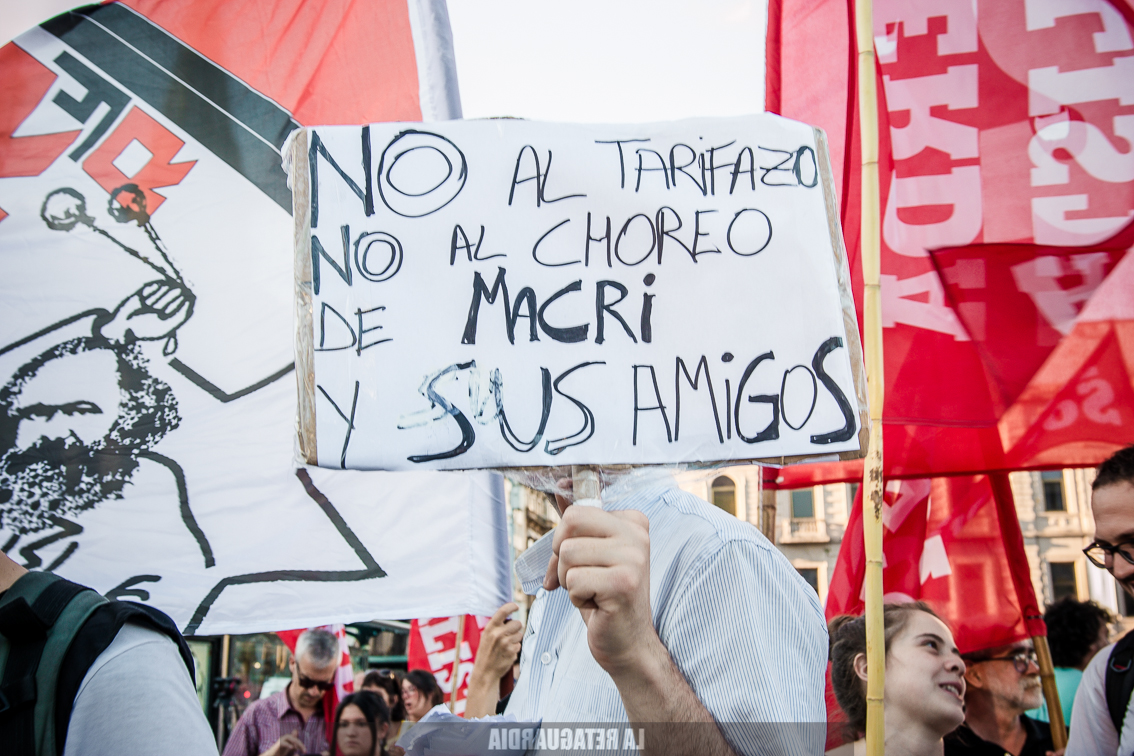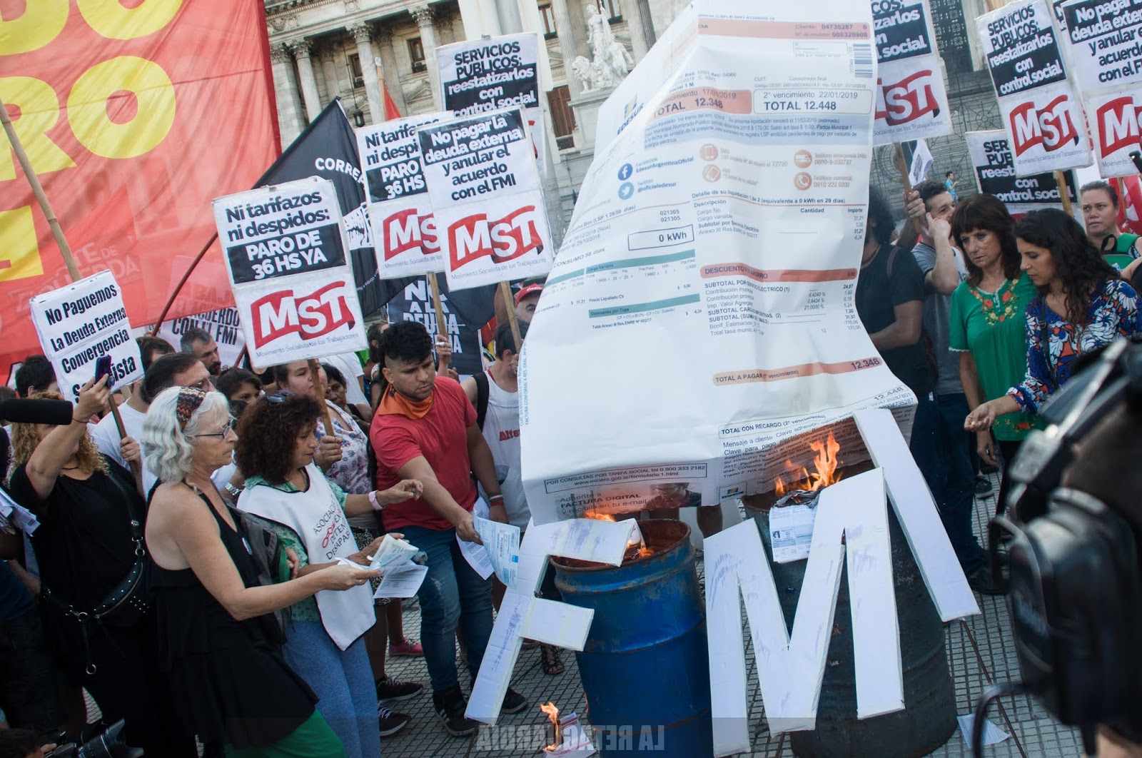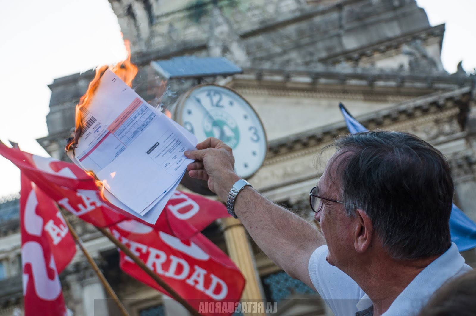 El jueves pasado las organizaciones y partidos políticos que componen el Encuentro Memoria, Verdad y Justicia (EMVyJ) se concentraron en la Plaza de Congreso para repudiar el tarifazo que aplicó el Gobierno de Mauricio Macri en los servicios de agua, luz y gas. Con una quema simbólica de boletas, un muñeco personificando a Macri y las siglas del Fondo Monetario Internacional (FMI) realizaron un acto donde denunciaron que el aumento de tarifas no conduce a un buen servicio ya que ese mismo día y solo en Capital Federal hubo cortes de luz que afectaron a mas de 30 mil usuarios. Denunciaron que este paquete de aumentos es parte del ajuste que impone el FMI. (Por Natalia Bernades y Agustina Salinas para La Retaguardia)