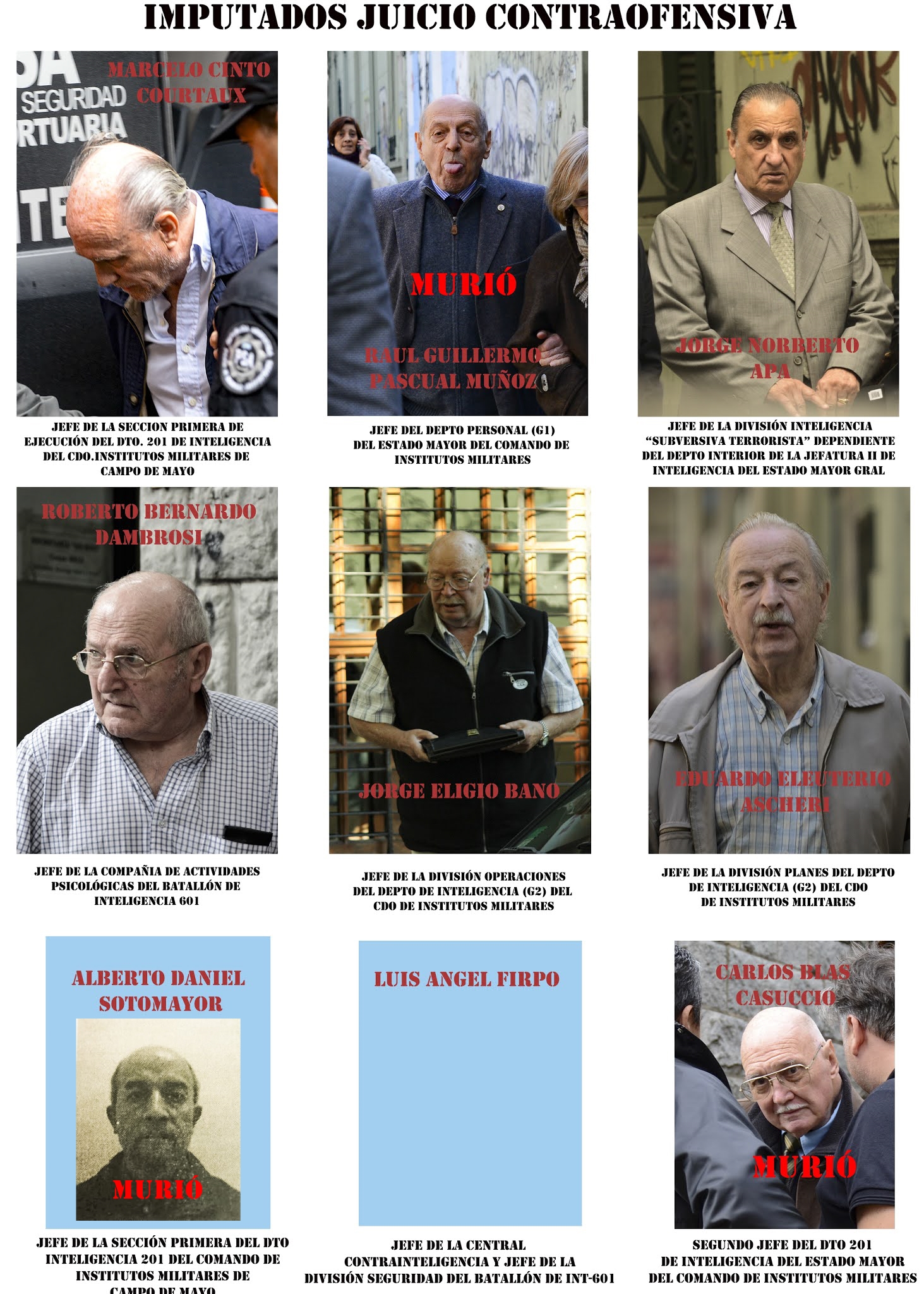 Compartimos un listado y una breve reseña de los 9 imputados que llegan a juicio en esta causa por la represión a la Contraofensiva Montonera, tanto en Argentina como en Brasil, Perú y España. El próximo martes comienza el debate en el TOF 4 de San Martín, desde las 9 horas.