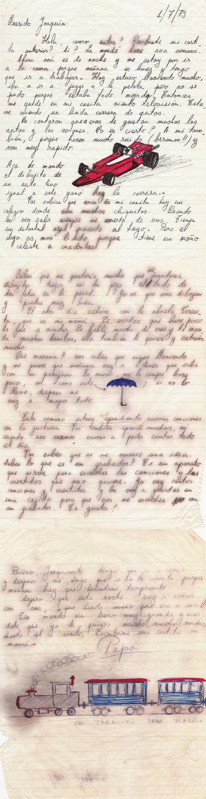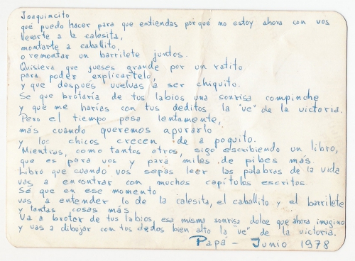 Joaquín logró construir un vínculo inicial con Federico Frías Alverga, su papá, a través de las cartas que él le enviaba, escritas a veces detrás de una foto. Como una postal, viajaban hasta México desde donde una amiga, que conocía las direcciones de ambas puntas, oficiaba de enlace y las reenviaba; así llegaban a las manos pequeñas de Joaquín, que aún no sabía leer, tendría unos 3 años. “Me las leía mi mamá como si fueran un libro de cuentos”. Tenían dibujos para captar la atención de un niño, efecto evidentemente conseguido porque Joaquín tiene presentes todavía esas imágenes. “De esa manera, yo sabía que tenía un papá que no estaba, no entendía bien por qué, pero estaba presente. Yo quisiera leer para que tengan una idea del tono de la voz. A veces las escribía detrás de una foto, con letra apretada. Como esta —levanta y muestra una foto escrita por detrás—. Como una postal… me decía cosas como estas: