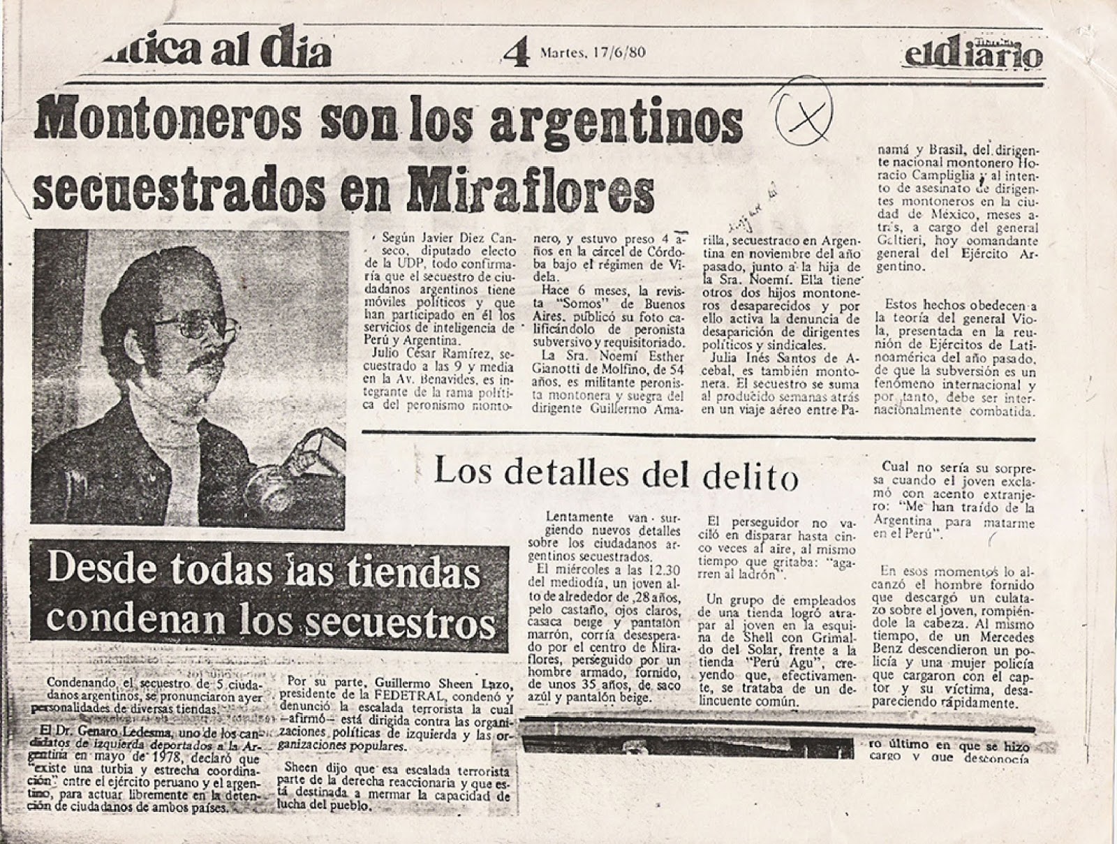 “Vivía con mi mamá en Neuquén y empiezan a llegar recortes de diarios de Perú que hablan donde mencionan a mi papá como secuestrado. En paralelo mi abuela se empieza a enterar por informaciones periodísticas del secuestro de su hijo en Perú. No entiende muy bien qué había pasado. Se sabía que podía pasar lo peor”. Ahí se le quiebra la voz, pero más que por el dolor, la emoción es síntoma del orgullo por su abuela. “Comienza a hacer las presentaciones de habeas corpus. Se inicia un proceso judicial de utilería… se rechaza el pedido. Se relaciona con las Madres de Plaza de Mayo. Idas y vueltas. Esta info la adjunta a su pedido de habeas corpus. El secuestro salió en el diario de Perú”. Toma un recorte entre sus papeles y lee: “El miércoles a las 12:30 del mediodía, un joven alto de alrededor de 28 años, pelo castaño, ojos claros, casaca beige y pantalón marrón, corría desesperado por el centro de Miraflores perseguido por un hombre armado, fornido, de unos 35 años, de saco azul y pantalón beige. El perseguidor no vaciló en disparar hasta cinco veces al aire, al mismo tiempo que gritaba ‘agarren al ladrón’. Un grupo de ancianos de una tienda logró atrapar al joven creyendo efectivamente que se trataba de un delincuente común. Cuál no sería su sorpresa cuando el joven exclamó, con acento extranjero: ‘me han traído de la Argentina para matarme en el Perú’. En esos momentos lo alcanzó un hombre fornido que descargó un culatazo sobre el joven, rompiéndole la cabeza. Al mismo tiempo, de un Mercedes Benz, descendieron un policía y una mujer policía, que cargaron con el captor y su víctima desapareciendo rápidamente». Cuenta luego que su abuela adjuntaba en sus reclamos ese tipo de publicaciones.”La noticia se amplifica rápidamente. En diarios de Francia, de Brasil, incluso de Argentina, porque el tema escala a niveles diplomáticos”.