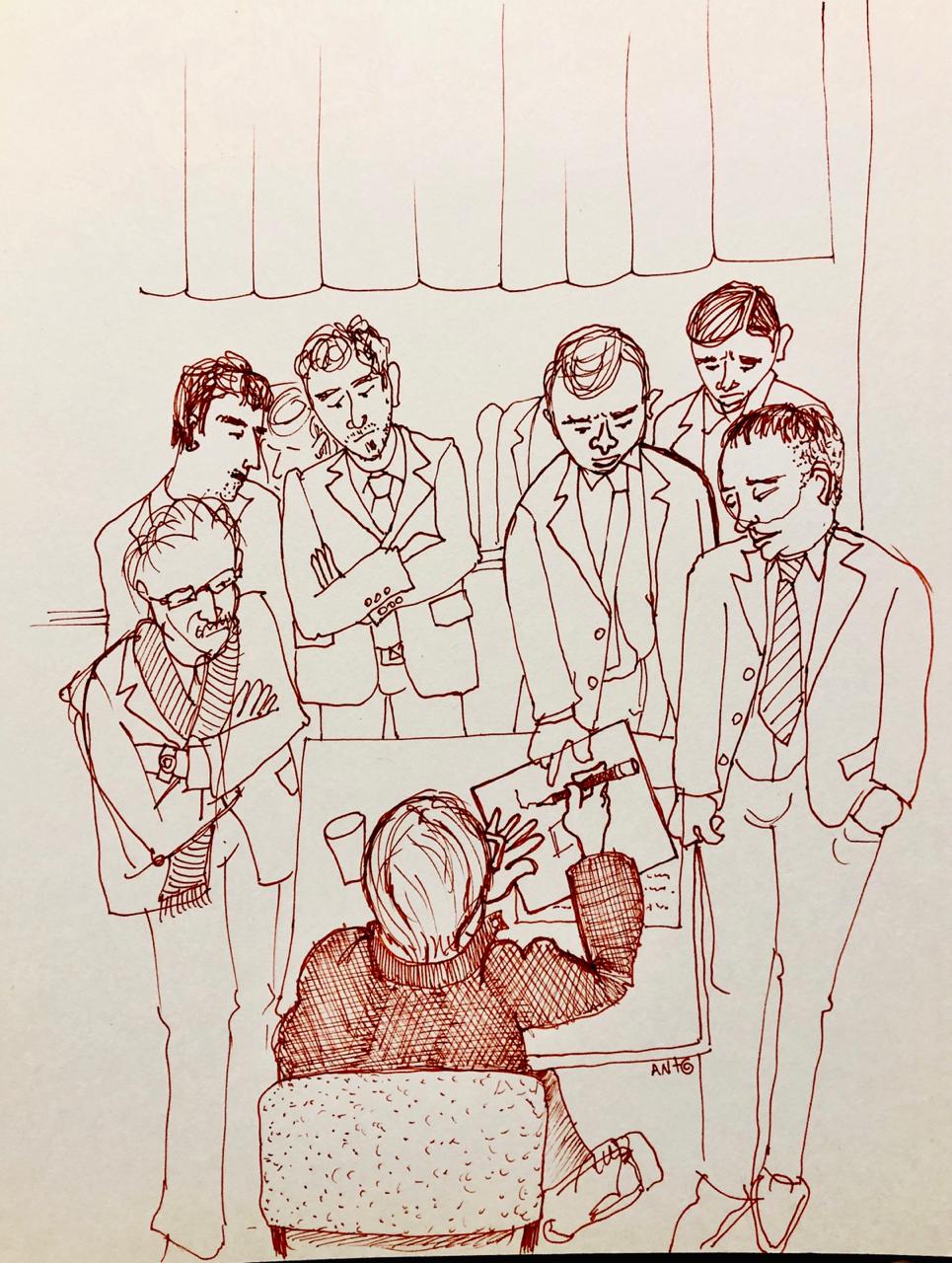 Casi 40 años después, Álvarez dibuja frente al Tribunal y los abogados y abogadas, el lugar elegido por los militares para fraguar el enfrentamiento. Ante la ausencia de una pizarra, en lugar de pararse a dibujar y que lo vemos todos y todas en la sala, las partes se acercan y lo rodean mientras él afina la pluma de su memoria y la vuelca al papel, sentado en su silla de testigo. Entre mediados de agosto y septiembre de 1979, Álvarez trabajó como mozo en el bar La Barra, dentro de lo que se conocía como Ciudad Comercial Canguro, en Munro. El lugar era un antiguo mercado que habían arreglado, con filas de locales comerciales en el centro; hoy podríamos decir una especie de shopping. La zona tenía una urbanización poco relevante: la empresa contrataba colectivos para traer clientes o personal desde Puente Saavedra, que ingresaban por la parte de atrás, una manzana abierta donde había un estacionamiento bastante precario en el que cabían 5 o 6 autos.