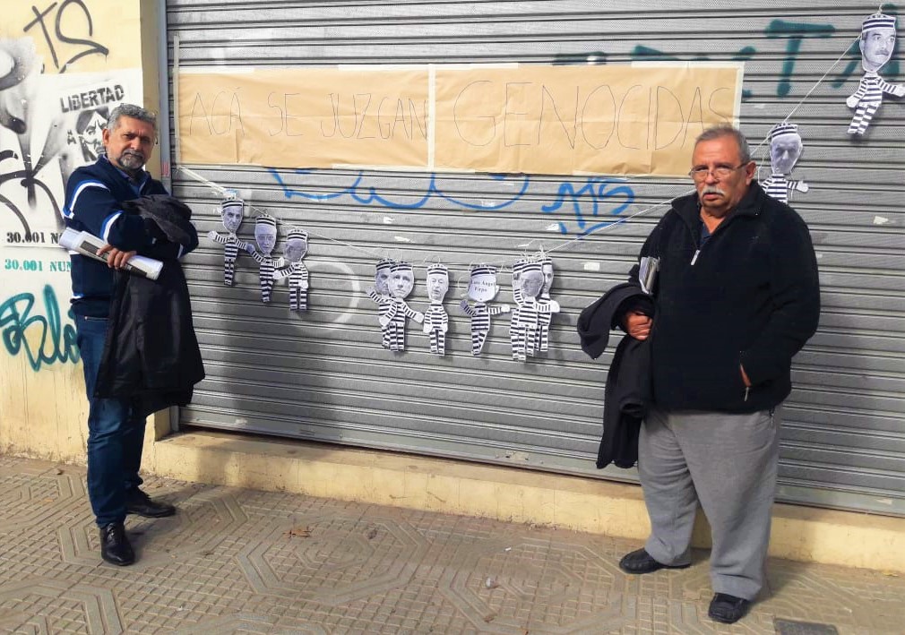 Mientras los genocidas están adentro, se preparó una intervención afuera del tribunal para que la vieran al salir. Luz Benítez le puso letra. (Foto: Agustìn Garrido/DDJ) |
