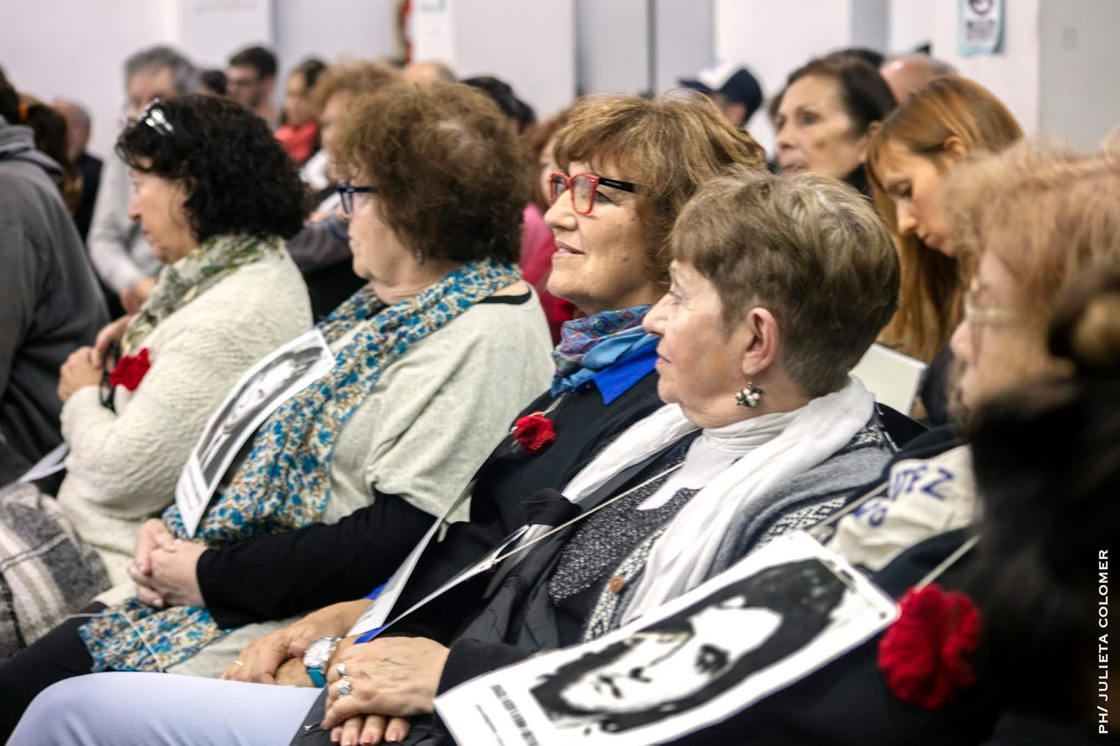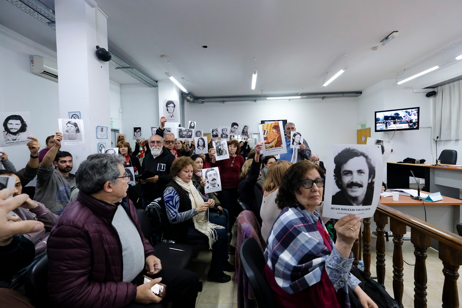 | Fotos en alto ante el ingreso de los genocidas. En primer plano, una amiga de Olga Chamorro. Ambas llegaron desde Toronto, Canadá. donde se quedaron después del exilio. (Foto: Gustavo Molfino/DDJ) |
