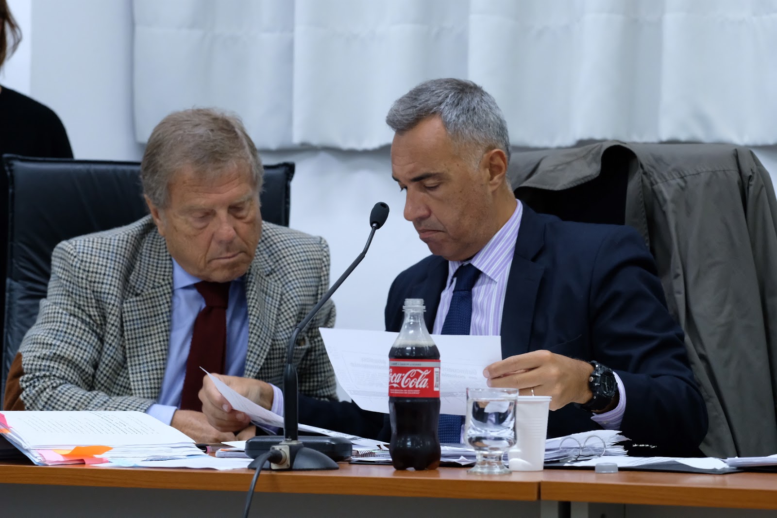 | El juez De Korvez (izq.) y el presidente del tribunal, Rodrìguez Eggers, analizando el pedido. (Foto: Gustavo Molfino/DDJ) |