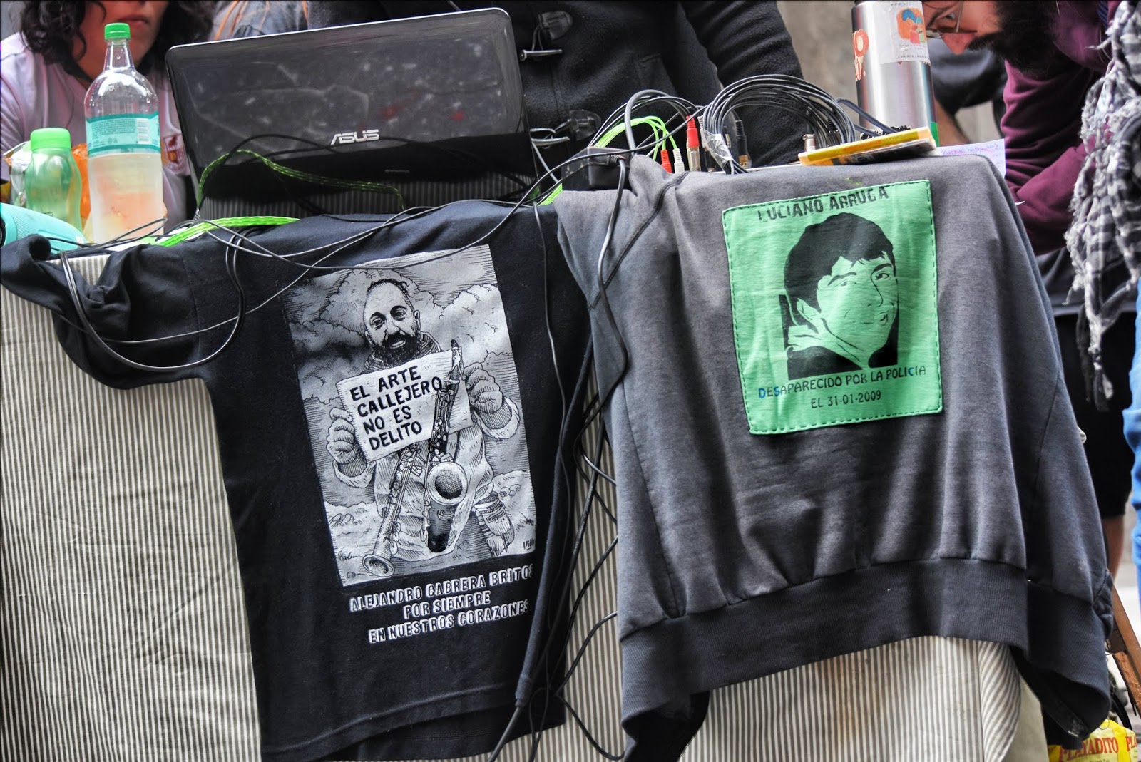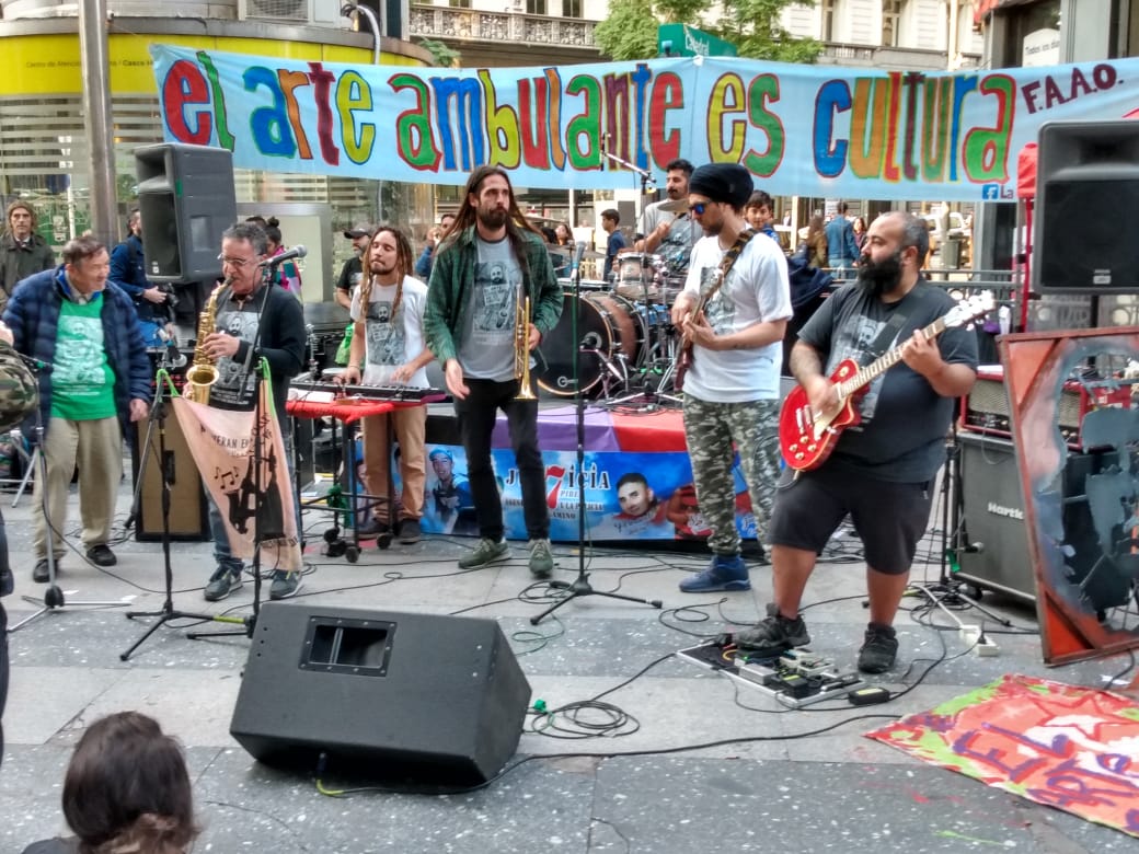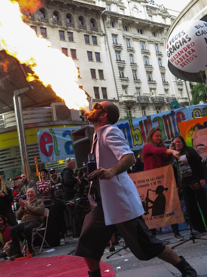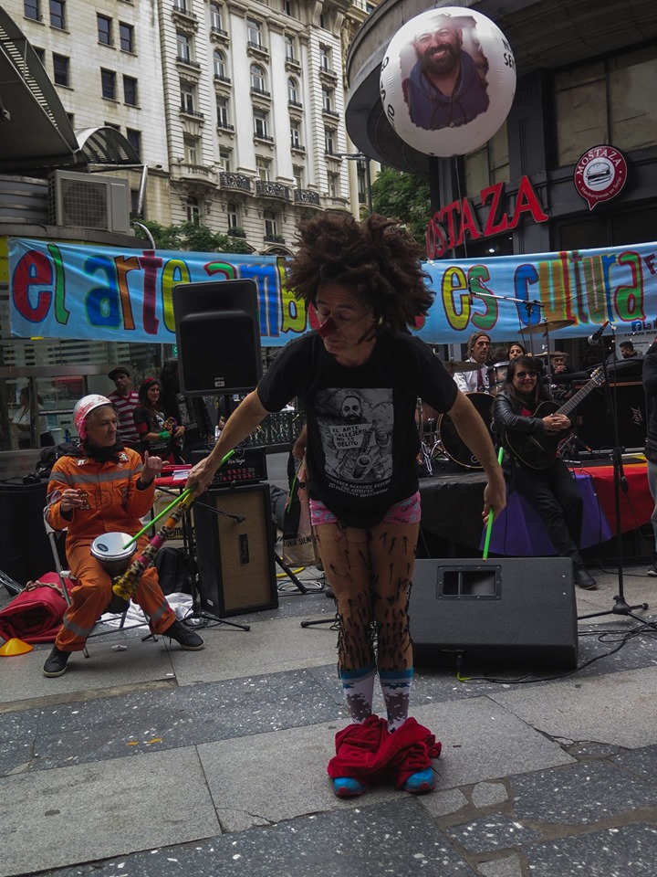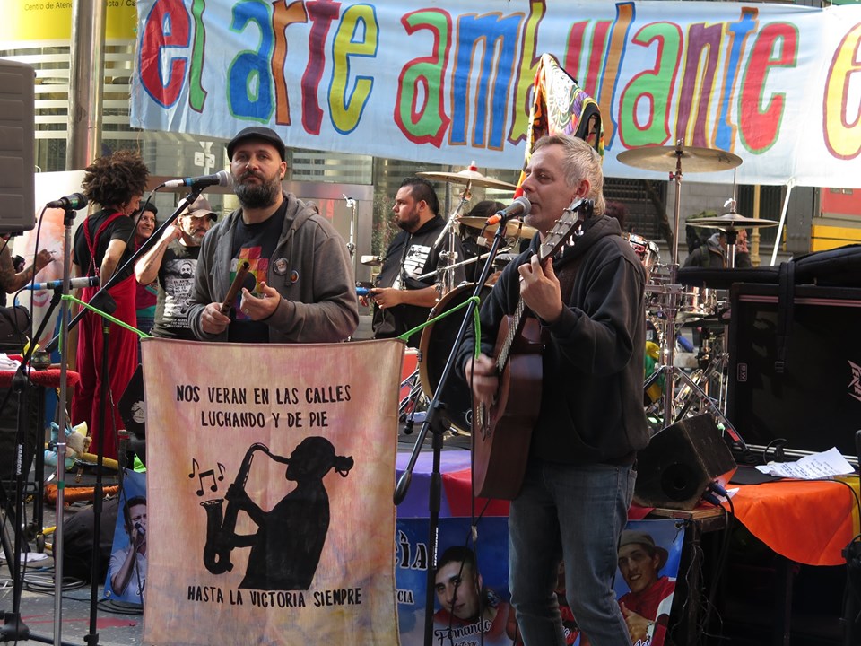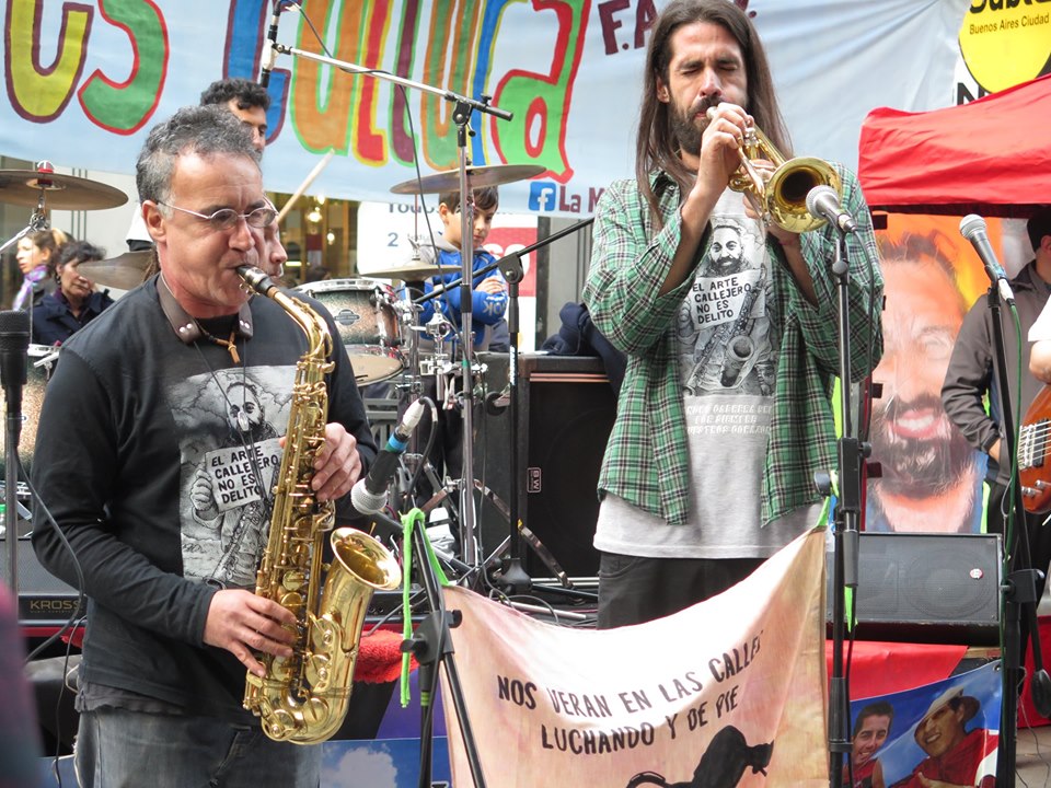 Arte en todas sus formas posibles. Colores diversos y fuertes. Calle. Protesta. Alegría. Emoción. Solidaridad. Es difícil pensar en que una jornada de homenaje represente tan bien al homenajeado. Entre risas y llantos ruidosos, Alejandro Cabrera Britos generó ayer una nueva jornada de protesta en defensa del arte callejero. Fue ayer en Diagonal Norte y Florida. Todo el festival fue emitido en vivo por Zona Libre (la radio de Familiares y Amigos de Luciano Arruga), La Retaguardia, Radio Presente y La Colectiva. Compartimos las fotos de González Ve y Juan Cicale, el audio de toda la jornada y los videos en vivo de nuestro Facebook. (Por La Retaguardia)