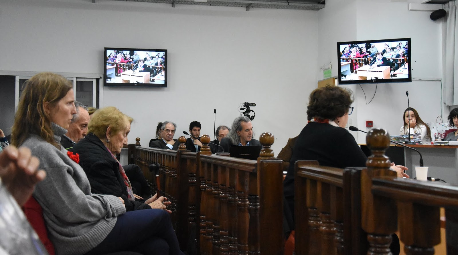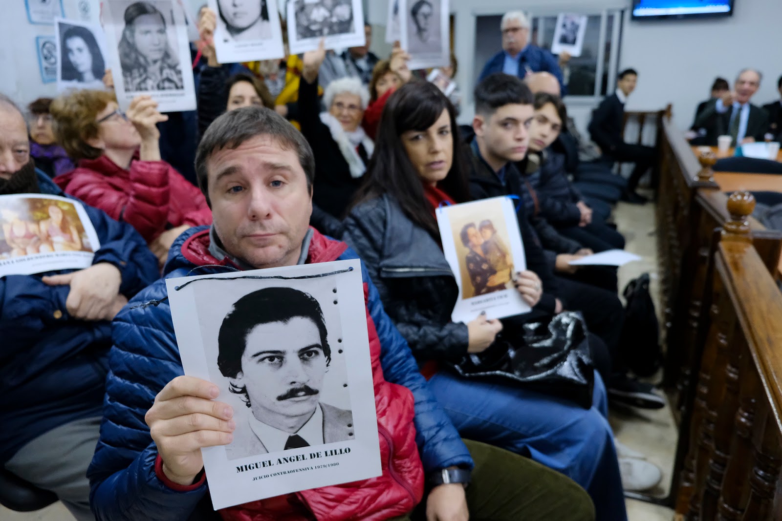 Como cada mañana, al ingresar y al irse los imputados, las fotos de quienes no están se levantan para observarlos. (Gustavo Molfino/DDJ) |
