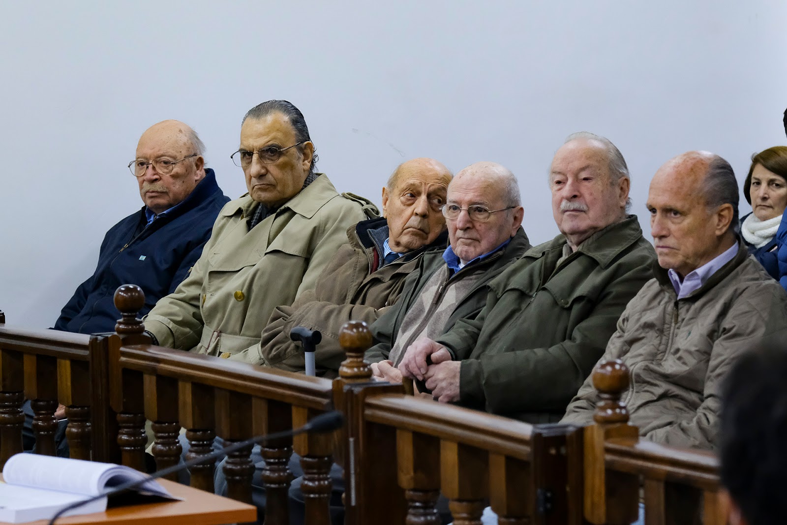 | En primera fila, el poco rato que pasan en la audiencia. De izq. a der. Jorge Bano, Jorge Apa, Raúl Muñoz, Norberto Dambrosi, Eduardo Ascheri, Marcelo Cinto Courtaux. (Gustavo Molfino/DDJ) |