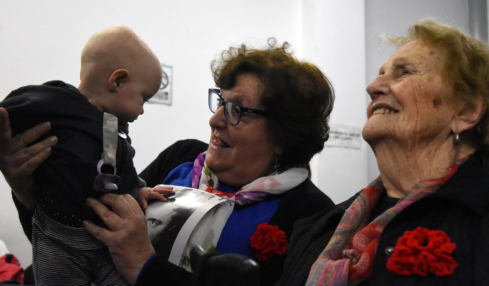 | Susana Brardinelli, antes de dar su testimonio, juega con su sobrino nieto. Al lado su mamá, Irma Ortolani, que tiene 90 años y fue la encargada de tejer las flores rojas que abrigan los corazones de buena parte del público. (Fabiana Montenegro/DDJ) |