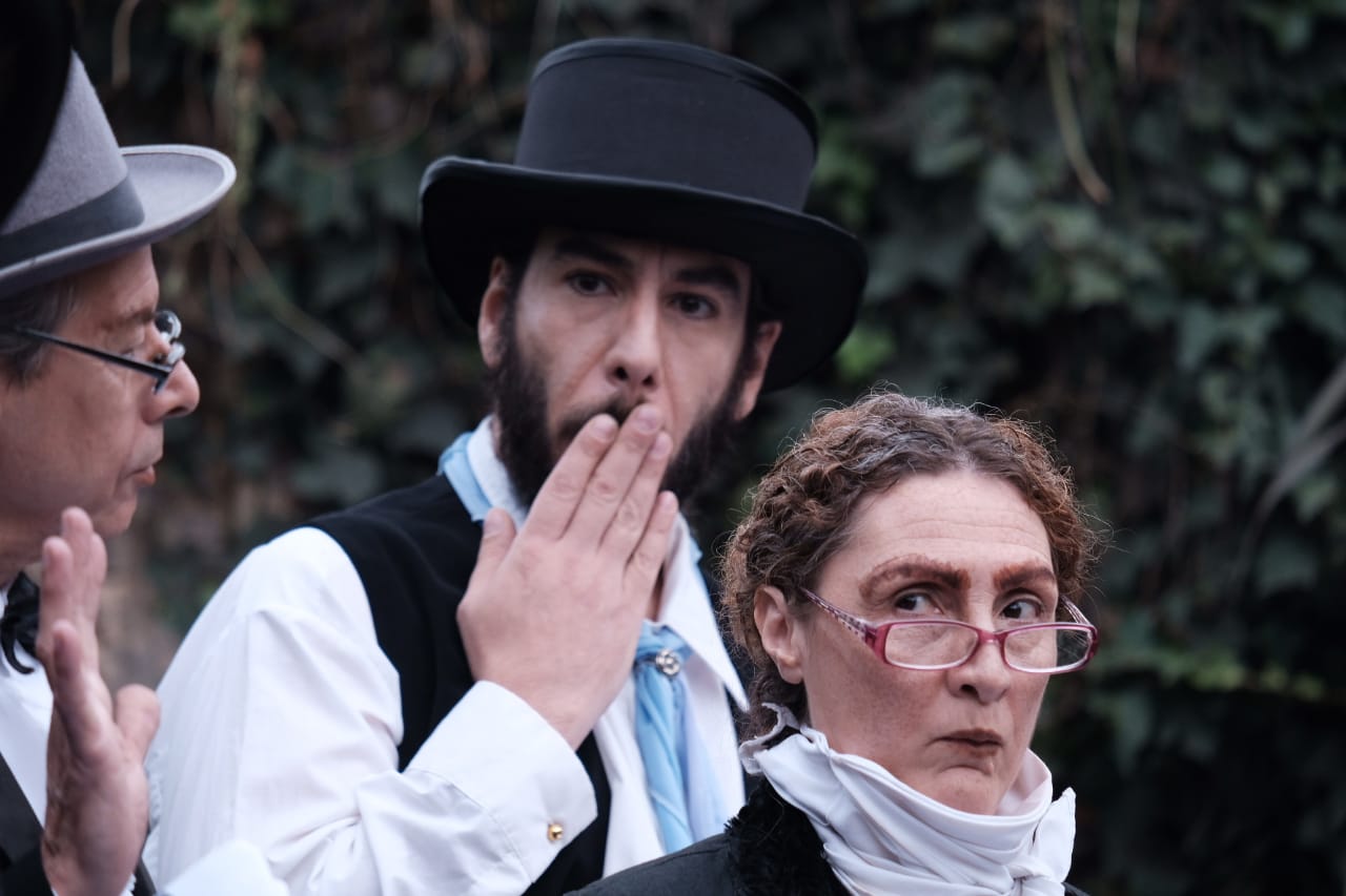Un grupo de pibes y pibas encontraron un lugar donde sentarse a leer, que interrumpieron por un rato para sumarse a ver un segmento de la obra del grupo de teatro comunitario del barrio, Res o no Res, montada en el jardín colmado de personas sentadas en banquitos, reposeras, paradas, tiradas en el pasto.