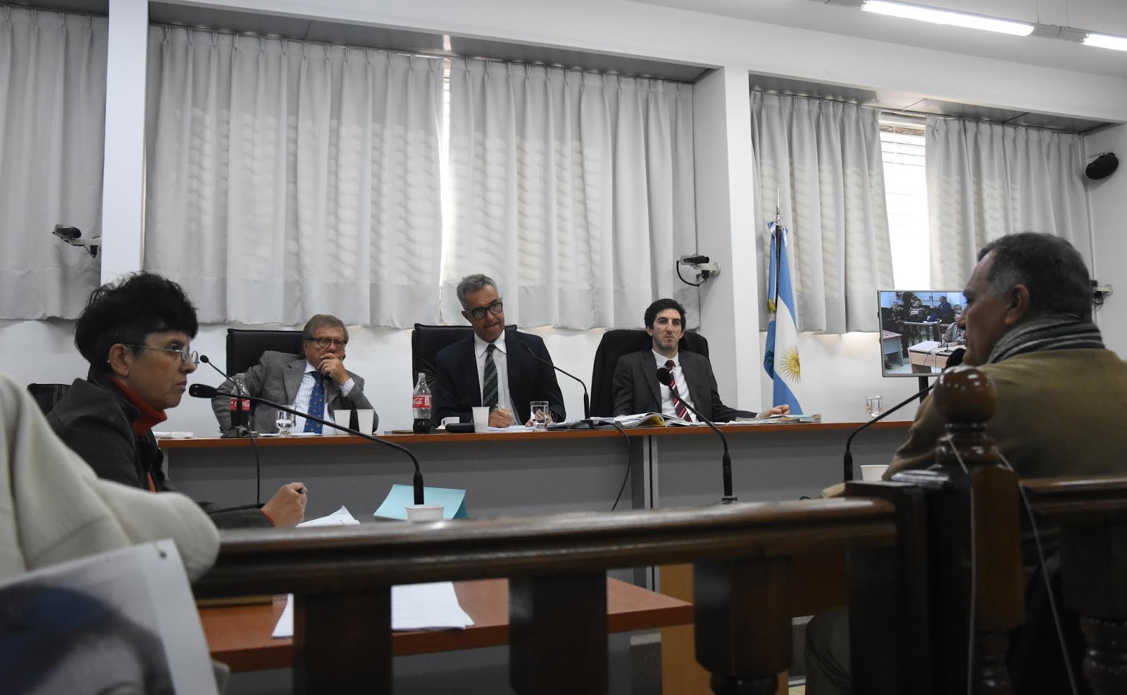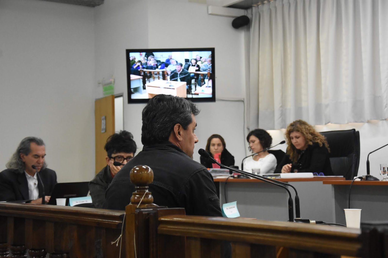 | Sosti escucha con atención a César Dávila, el marido de Marta, fue el último testigo de una jornada que quedará en la historia. Lo observan también los integrantes del tribunal: de izq. a der., De Korvez, Rodríguez Eggers y Mancini. (Fabiana Montenegro/DDJ)
