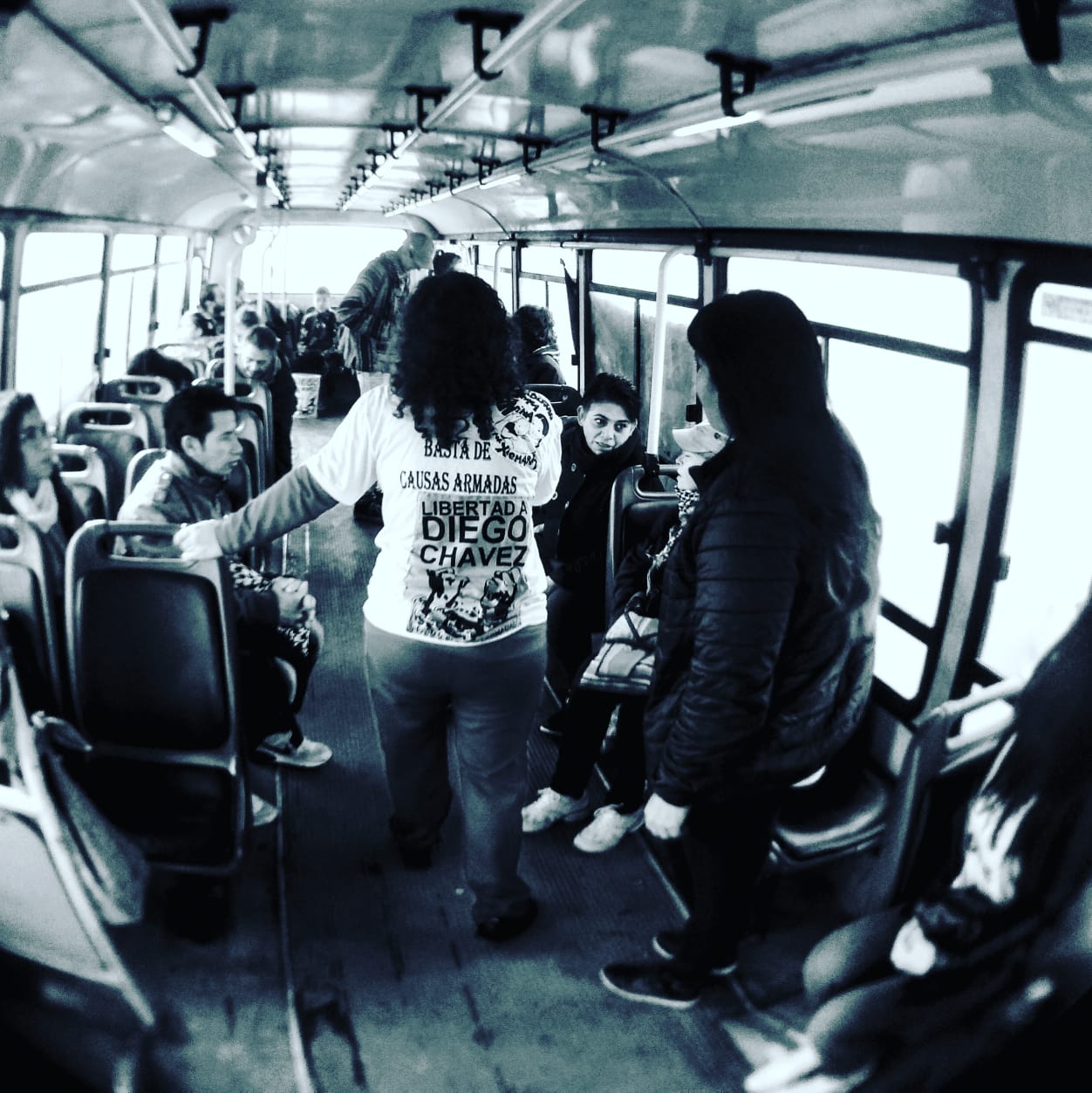 Foto: Fabiola Aguirre, la mamá de Diego Chávez, de espaldas, en el micro que transportó a la gente que fue a bancar a los tribunales de Mercedes. (Gentileza: Changuito Cañero)