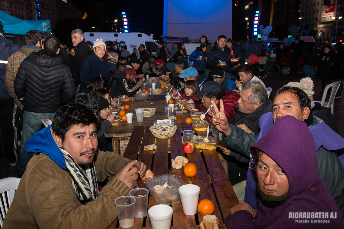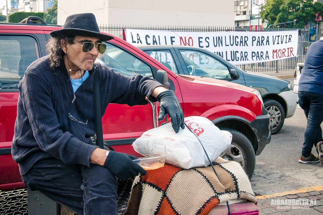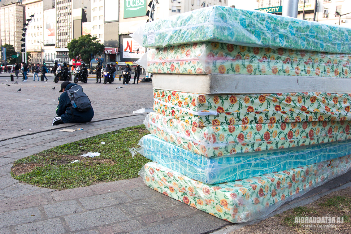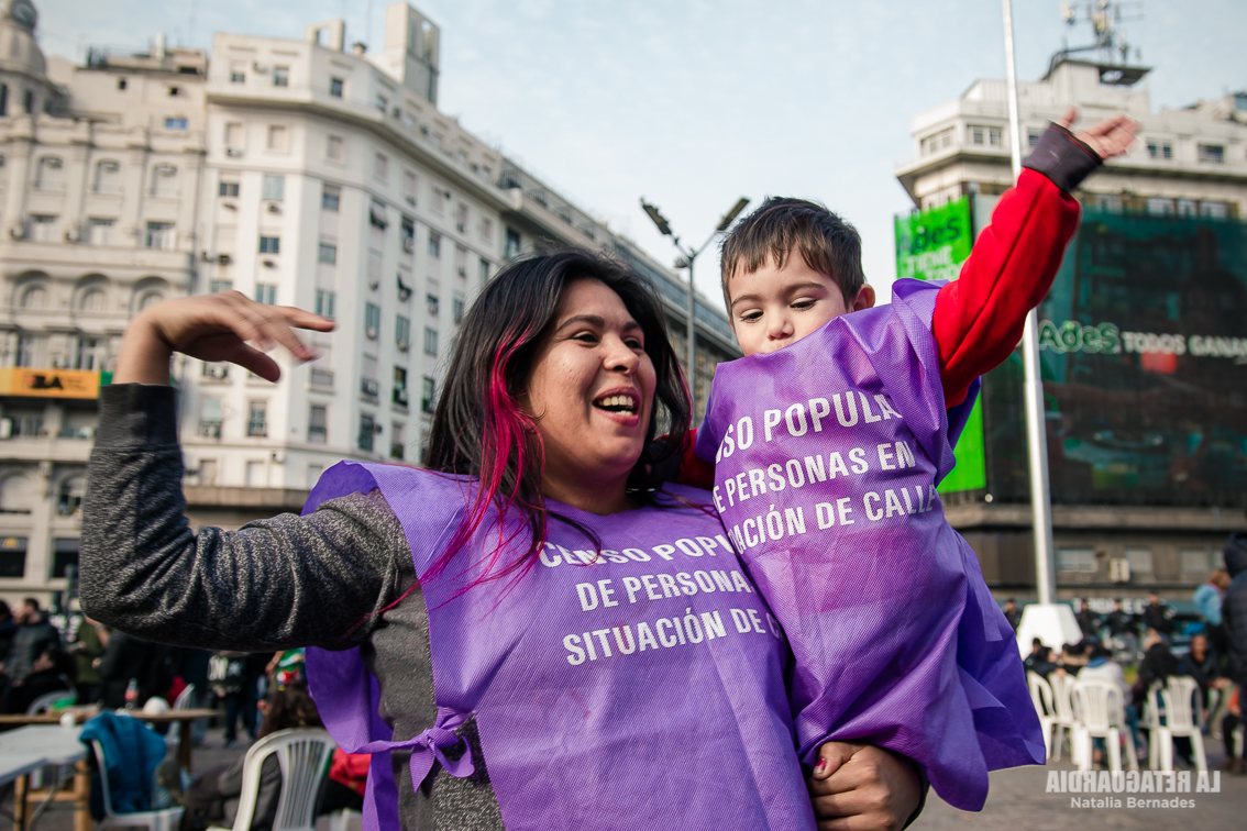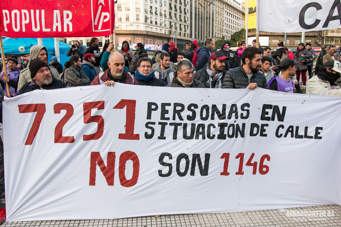 La actividad comenzó a las 12 horas, al lado del obelisco y con fuerte presencia policial. El sol daba un pequeño alivio a las personas que están en situación de calle, pero sabíamos que al llegar la noche volverían el frío y el desamparo. Las agrupaciones que organizaron la jornada conocen la problemática. Son quienes realizaron el Censo Popular de Personas en situación de Calle 2019, que dio como resultado que sólo en la Ciudad de Buenos Aires hay 7251 personas en la calle. 40 son mujeres embarazadas y 871 niños y niñas.
