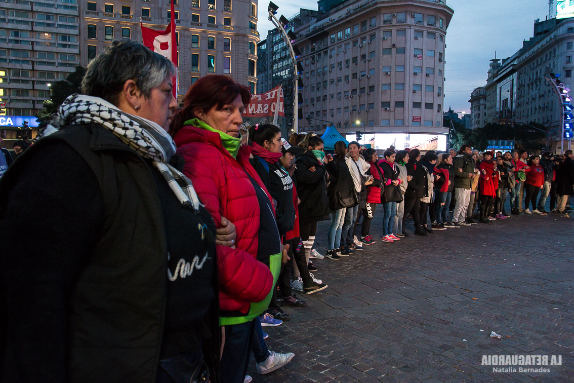 Finalizada la olla del almuerzo, y ante la permanente presencia policial, en asamblea se decidió realizar un anillo humano para poder instalar la carpa. Al ver la gente organizada, la policía se preparó para reprimir. Los primeros colchones llegaron junto a los gases lacrimógenos y los palos. La policía se llevó detenidas a dos personas y varios colchones. Colchones que estaban destinados para que la gente no durmiera sobre un cartón una noche de cinco grados. La situación se mantuvo tensa por varias horas. Las mujeres, que antes habían estado cocinando en las ollas y amasando tortas fritas, se sentaron en acto pacífico frente a las motos policiales. A las 18 horas, Alejandro Amor, Defensor del Pueblo de la Ciudad, intervino como mediador. Se acordó hacer la olla de cena pero no el refugio y una reunión en el Ministerio de Desarrollo Social, que se estaba por llevar adelante al cierre de esta nota, a las 16 horas. Parte del acuerdo era que se retirara la policía para realizar la cena en paz. Lejos de cumplir el acuerdo, a modo de provocación, la policía motorizada circuló bien cerca del cordón realizado por las mujeres.