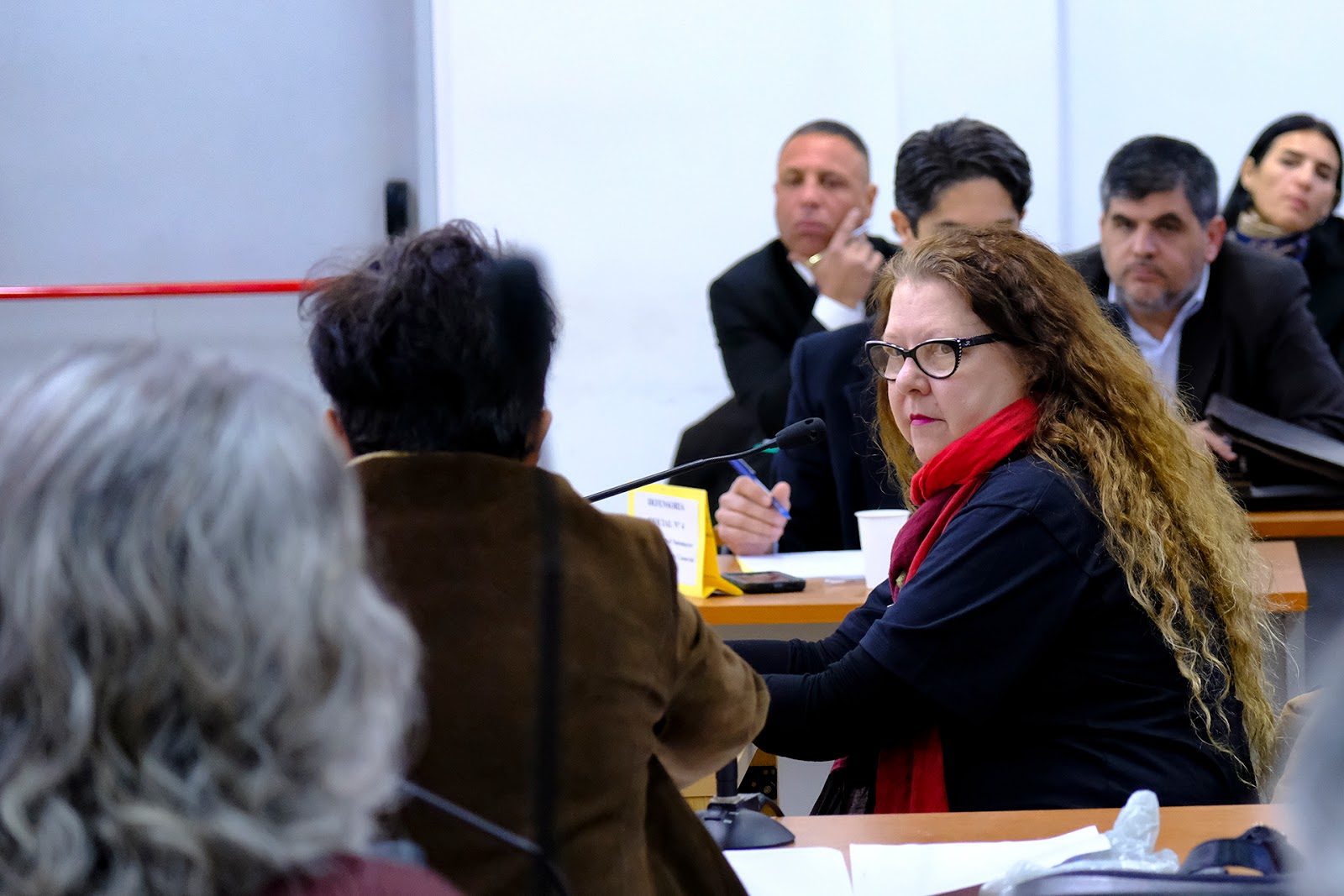 Hedman tiene un larguísimo pelo castaño claro que se apoya con comodidad sobre su espalda. Le dejó su campera abrigada a alguien por allí, por lo que su bufanda roja sobresalía entre sus ropas oscuras. También colgaba otro pañuelo de colores. Sus anteojos de armazón negro contrastan con su tez blanca. Recordó durante su testimonio parte de su militancia en Resistencia. Nombró a diferentes compañeros y compañeras. “Algunos están presentes en la sala, como Ana Testa”, señaló.