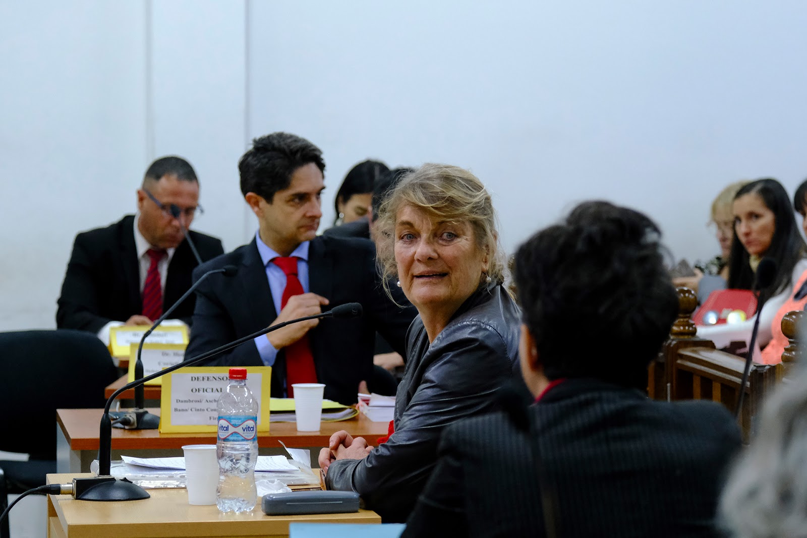 Los imputados se retiran de la sala de audiencia. Como la semana anterior, la primera testigo, Alicia Ruszkowski, los mira. La respuesta es la mirada al suelo. Lo mismo ocurre con las fotografías de las víctimas en esta causa. (Foto: Gustavo Molfino/DDJ) |