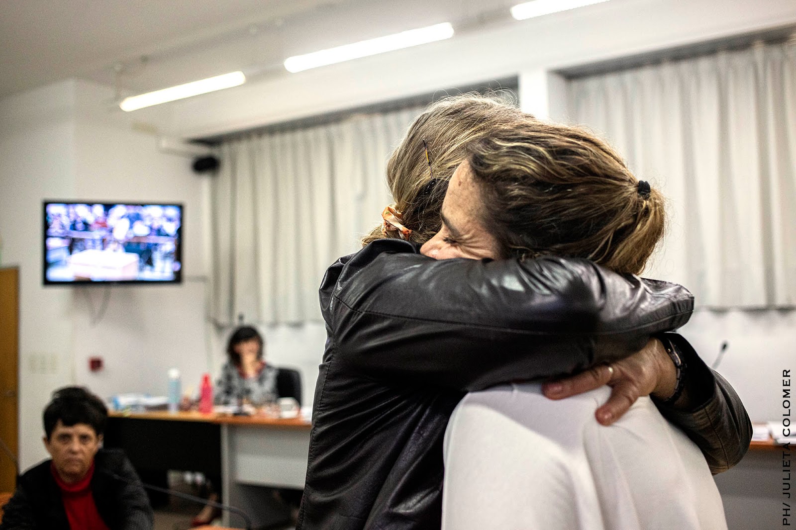 | Al finalizar, recibió el abrazo de su hija, Ana Pecoraro, que declaró inmediatamente después. |