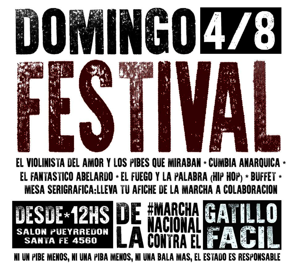 —Roxana Cainzos: Junto con familiares de víctimas de gatillo fácil y violencia institucional se armó un festival solidario para juntar fondos para la 5ta Marcha Nacional contra el Gatillo Fácil y poder solventar los gastos básicos para la misma. Es por esto que pedimos a todas y todos los compañeros militantes de distintos espacios que se acerquen y nos den su apoyo, su solidaridad. Estaremos este domingo 4 de agosto en Salón Puyrredón (Av. Pueyrredón 4560 – CABA).