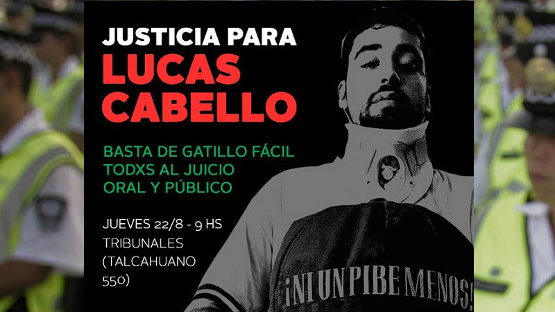 El 9 de noviembre del 2015, Lucas Cabello, un joven vecino del barrio de La Boca, fue atacado en la puerta de su casa frente a su hija de 2 años y su mujer por el efectivo de la ex Policía Metropolitana, Ricardo Ayala. El brutal accionar del agente, que disparó tres veces a quemarropa, le dejó heridas gravísimas a Lucas quien se recupera en silla de ruedas. Luego de casi cuatro años de lucha por parte de Lucas, su familia y las organizaciones del barrio, finalmente el próximo jueves 22 de agosto iniciará el juicio oral y público ante el Tribunal Oral en lo Criminal N° 1. El juicio se llevará adelante en los palacios de Tribunales, en Talcahuano 550. Ayala llega en libertad.