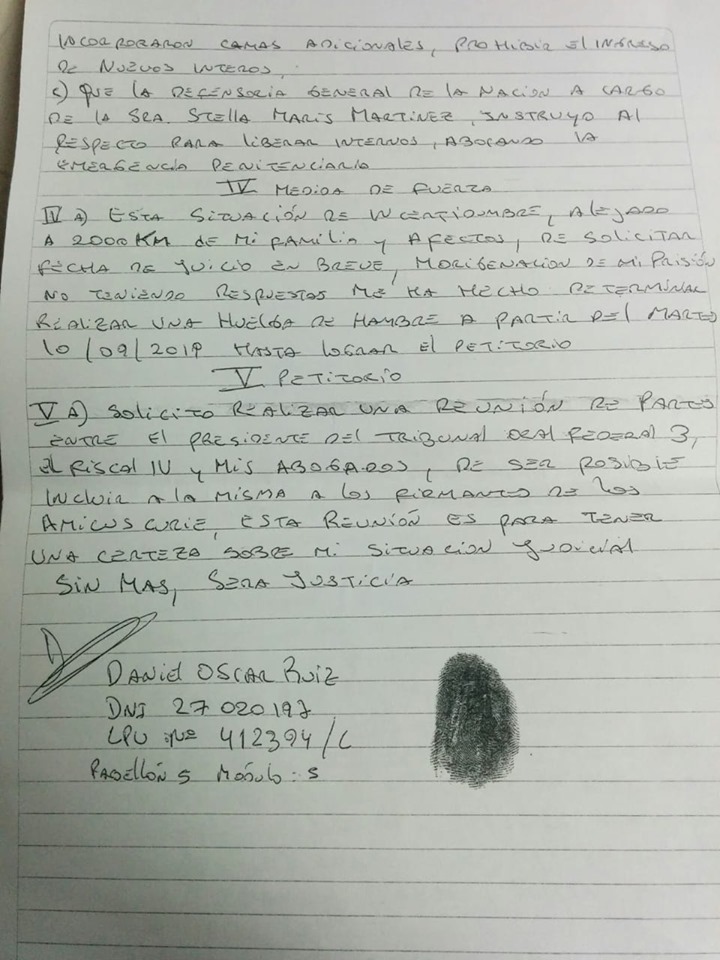 En una carta dirigida al Tribunal Oral Federal número 3, el dirigente petrolero y militante del Partido Socialista de los Trabajadores Unificado, solicitó una reunión entre el presidente del Tribunal, la fiscalía y sus abogados para “tener una certeza sobre” su situación judicial. Preso desde el 12 de septiembre de 2018, sin siquiera tener fecha para el comienzo del proceso y negada su excarcelación, comenzó una huelga de hambre. Además, Daniel Ruiz pide que consideren la situación del penal donde se encuentra, ya que “el Ministerio de Derechos Humanos de la Nación declaró ‘emergencia en materia penitenciaria’ por tres años”.