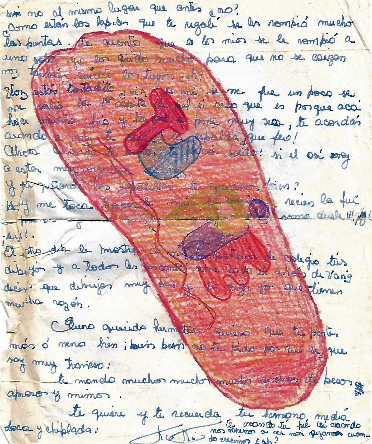 👆 Foto de portada: La carta que Verónica Cabilla escribió sobre el contorno del pie de su hermanito Mariano. El dibujo lo hizo la última vez que se vieron. Luego escribió la carta, poco antes de su secuestro y desaparición. (Gentileza de Ana María Ávalos para El Diario del Juicio)