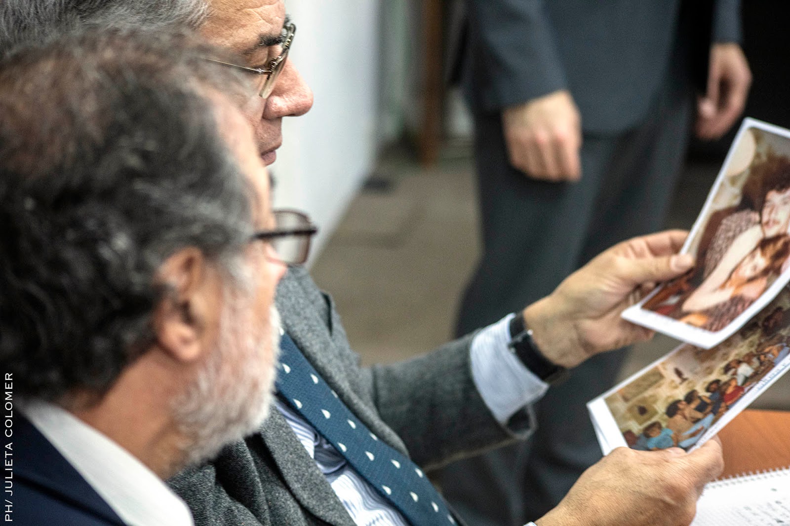 ☝ Flores sostiene más fotos. También las observa Ciro Annicchiarico, abogado por la querella de la Secretaría de Derechos Humanos de la Nación.