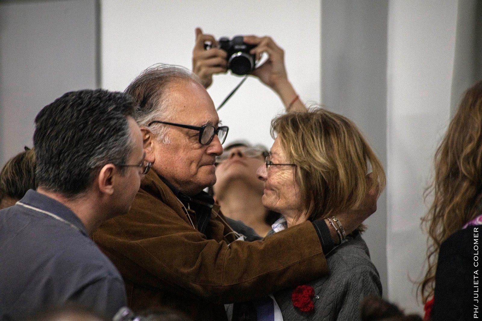 ☝ Entre los abrazos cariñosos, Susana recibió también algunos de compañeros a los que conoció a partir de este juicio, como es el caso de Adrián.