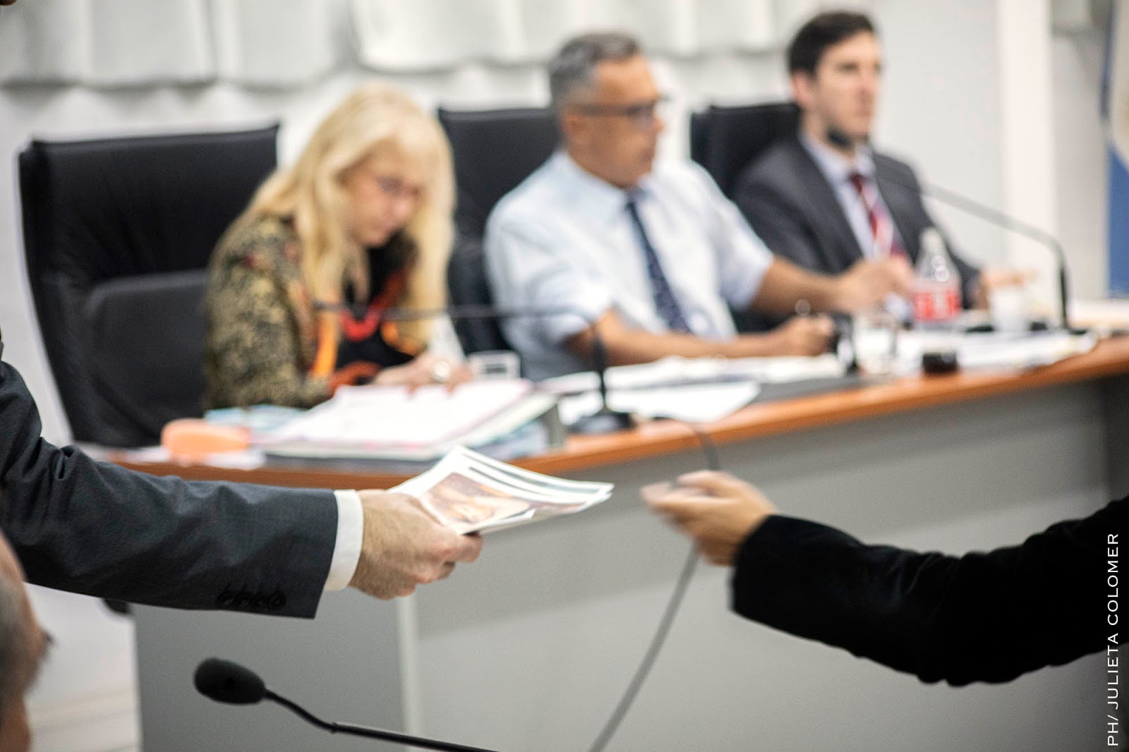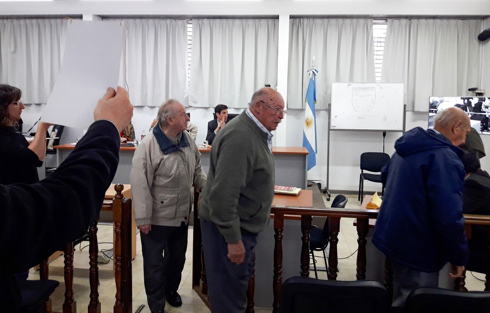 ☝ Muñoz está por sentarese. Lo sigue Bano. Detrás Ascheri, el del cafecito en el bar. Como en cada ingreso y salida, las pancartas en alto. Los acompaña un silencio ensordecedor, apenas interrumpido por los clicks de las cámaras fotográficas.
