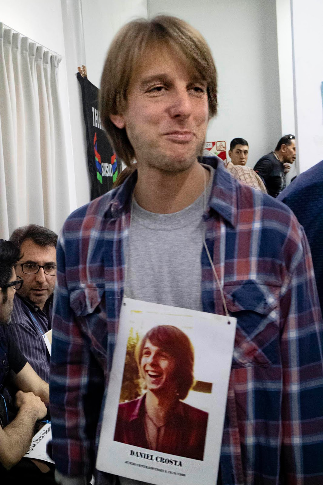☝ Con la misma sonrisa que su madre en la foto, Santiago Roca sale de la sala. Tras su testimonio hubo un cuarto intermedio para ajustar detalles técnicos y entrar en la videoconferencia con México.