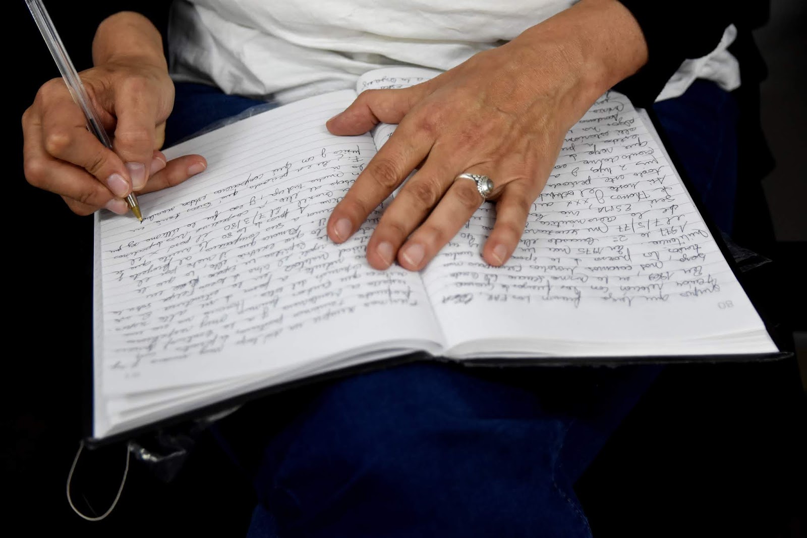 ☝ Foto de portada: En las audiencias se suele ver gente tomando notas. Algunas en computadoras, otras a mano, como en este caso. Unas pocas son periodistas. Sobresalen quienes realizan trabajos especiales para sus estudios, o incluso algunos familiares que apuntan datos esenciales de un juicio que está reescribiendo la historia en torno de la Contraofensiva de Montoneros, un poco más lejos de la estigmatización, un poco más cerca de la justicia. 📷 Fabiana Montenegro