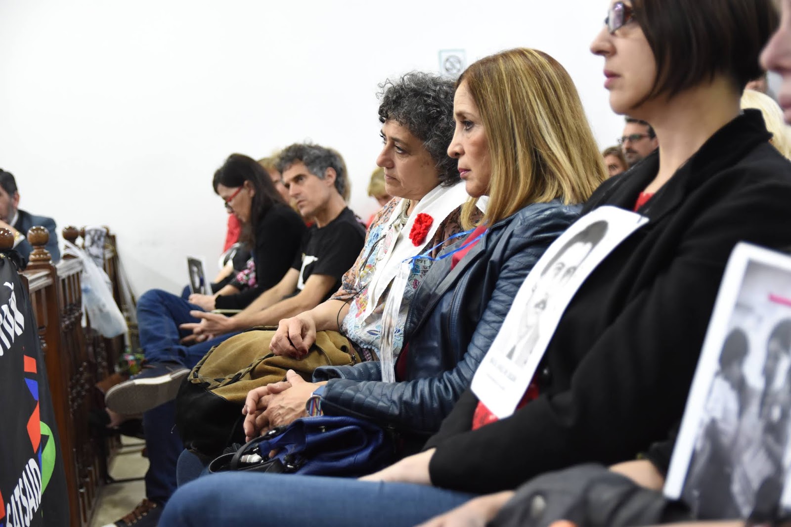 ☝ A diferencia de audiencias anteriores, los imputados no tuvieron compañía familiar, por lo que los asientos detrás de ellos fueron ocupados por familiares de las víctimas. Las fotos de los y las desaparecidos quedaron entonces detrás de sus posibles verdugos.
