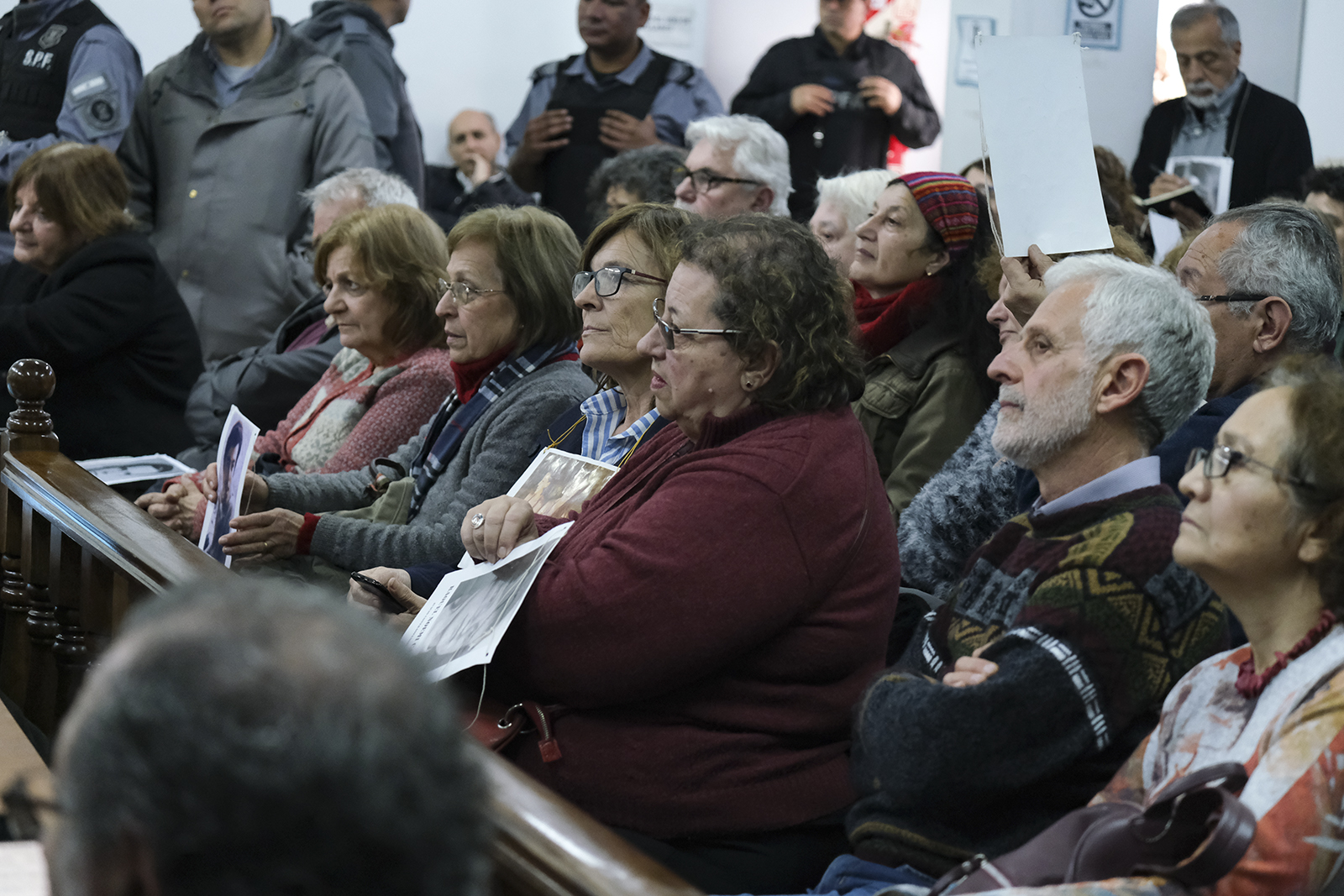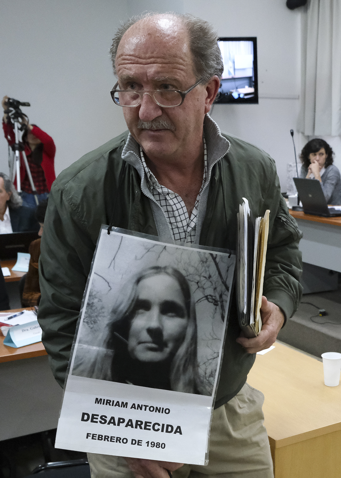 ☝ En las anteriores audiencias pudo notarse cómo los imputados miran al piso cuando entran y salen de la sala. Esta vez, se encontaron con un camino de fotos de personas desaparecidas en el suelo. Como puede verse, Ascheri, en esta ocasión, eligió no mirar al suelo.