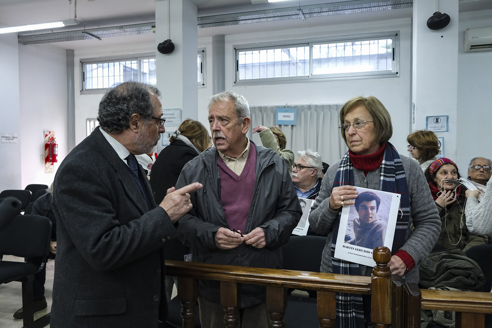 ☝ Ciro Annicchiarico, abogado querellante por la Secretaría de Derechos Humanos de La Nación, dialoga durante el cuarto intermedio con Rodolfo «Tojo» Ojea Quintana y su compañera, Graciela Cecilia Imaz.