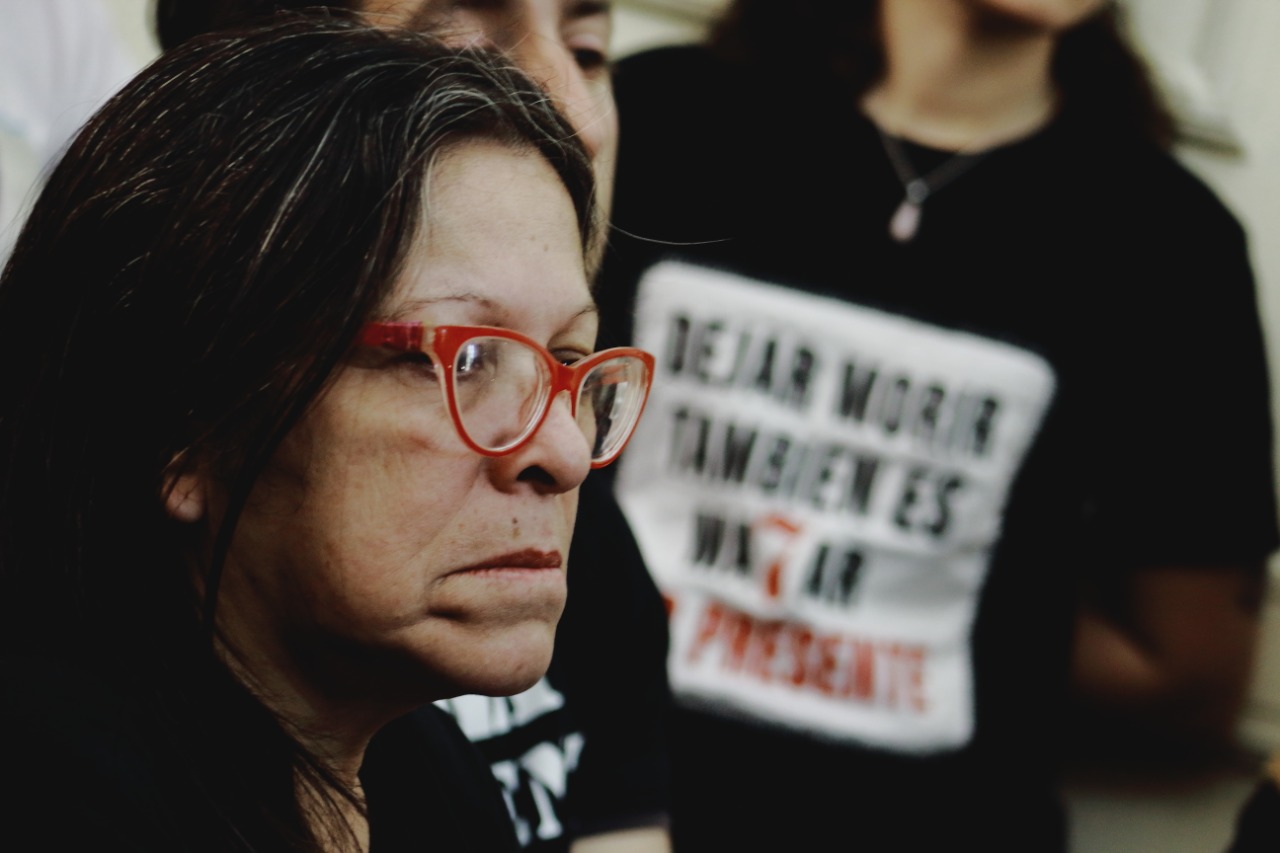 Mónica Raquel Alegre es la madre de Luciano Nahuel Arruga, joven desaparecido y luego asesinado por las fuerzas policiales en el 2009, en Lomas del Mirador, Provincia de Bs. As. Para las madres de Pergamino, es una compañera, una amiga y hasta una referenta en la lucha por la búsqueda de verdad y justicia por las muertes de sus hijos. Ellas, las madres de todos los pibes que sufrieron gatillo fácil, desapariciones forzadas o muertes por el sistema carcelario, son quienes más pueden sentir en carne propia, empatizar y comprender el dolor que sienten estas madres en un momento así de intenso como es el juicio por la muerte de sus hijos. Entre risas y chistes se saluda con Karina, la tía de Fernando Latorre, para hundirse luego en un abrazo con Silvia Rosito, la mamá. Un diálogo de ojos húmedos se sucede entre las dos. En el pecho de Silvia la cara de Fer, en el pecho de Moni, Alejandro Cabrera Britos, y en la espalda, Luciano.
