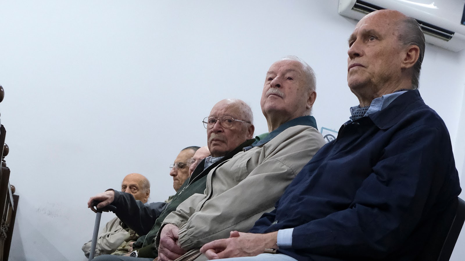 👆 Los imputados, durante el poco tiempo en el que permanecen en la sala, hasta que el tribunal les otorga el permiso para retirarse. El que observa fijo a la cámara, tercero en la fila, en Jorge Eligio Bano, uno de los integrantes del Batallón de Inteligencia 601 del Ejército, acusados en esta causa.