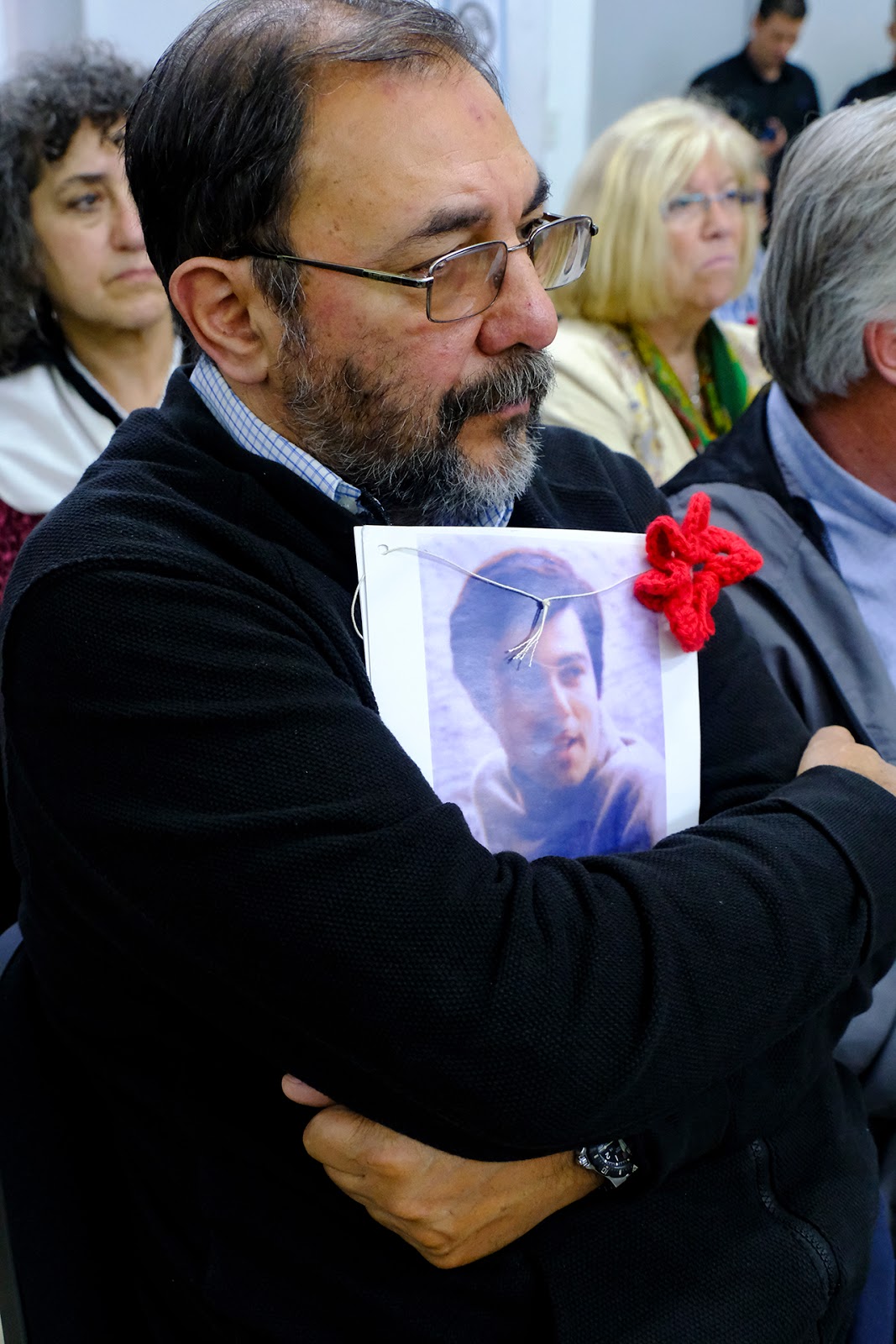 👆Observa en primer plano Gabriel Sesar, actual pareja de Aixa Bona, que acompaña a su familia en la reconstrucción histórica que remplaza al pacto de silencio de los genocidas. Más atrás, Magdalena Sesar, la hermana de Dolores.
