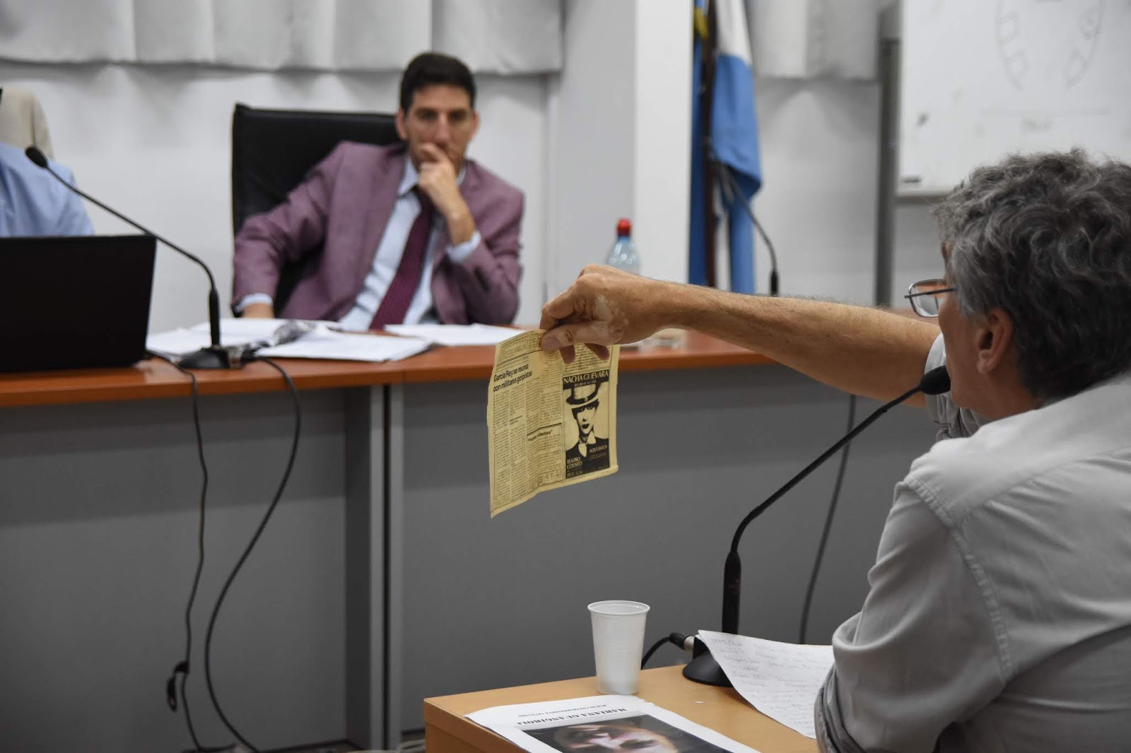 ☝ Ante la atenta mirada del juez Matías Mancini, Genoud muestra una de las solicitadas publicadas por Montoneros cuando ocurrió el secuestro de Genoud y varios integrantes más de Montoneros, que cayeron en una secuecia que alcanzó a juicio.