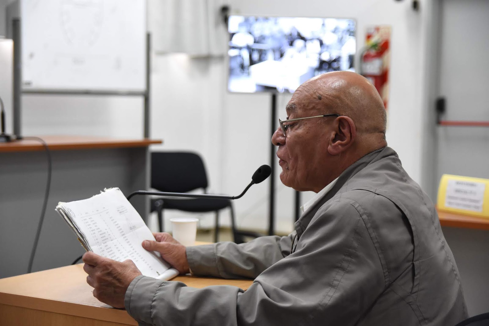 ☝ Fue uno de los jefes de los sectores de inteligencia dependientes del Batallón de Inteligencia 601 del Ejército que participaron de los secuestros, torturas, desapariciones y asesinatos de los y las militantes que participaron de la Contraofensiva de Montoneros. Cada vez que llega, el personal del Servicio Penitenciario que cuida con recelo que no se le tomen fotografías, le quita las esposas, y se las vuelve a colocar antes de que se retire. En esta jornada, eso ocurrió recién al finalizar la audiencia.