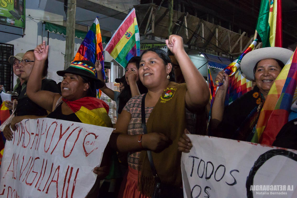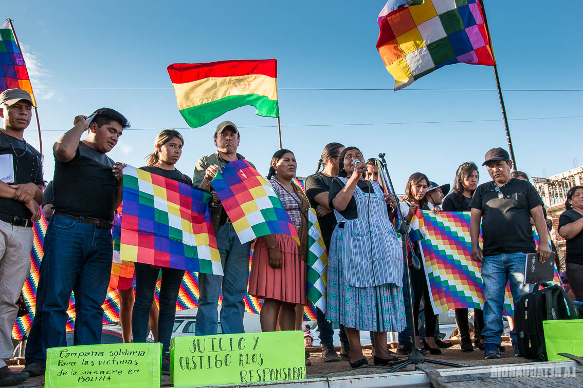 Prosigue Angélica Ponce, Ejecutiva Nacional Intercultural. Antes de ella, desfilan las voces de varios compatriotas, víctimas del golpe, que narran el horror que están sufriendo. Angélica inicia su enérgico discurso denunciando a “la prensa boliviana que se ha vendido a la derecha. Solo las radios comunitarias nos informan. Pero esta asesina, discriminadora racista, señora Añez usurpadora, está callando a las radios comunitarias”. El sol se esconde, da tregua, y Angélica continúa hablando iluminada por los celulares de sus compañeros. “El 22 de enero, la supuesta presidenta, legalmente, termina su gestión como senadora y también termina como autoproclamada. Más allá de ese día no es nada. Por eso nosotras, las mujeres de Bolivia, a la cabeza de las seis federaciones del trópico, a la cabeza de las organizaciones sociales y personalmente yo, convocamos a todas las personas a movilizarnos. Nosotras en Bolivia, si el 22 de Enero no sale esa mujer, estamos con fuerzas para entrar al Palacio Quemado y sacarla de sus mechas”. La ovación estalla al aparecer la referencia al ejemplo de la lucha de las Madres de Plaza de Mayo. Ponce finaliza diciendo: “Bolivia ya no es como antes. Ya despertó y nunca más se va a callar. No hay derecho ni fascista que lo calle. Bolivia es otro país, plurinacional. Por eso hoy, en Bolivia, resistiendo al golpe de Estado, vamos a restablecer la Constitución política. Patria o muerte. Venceremos”.