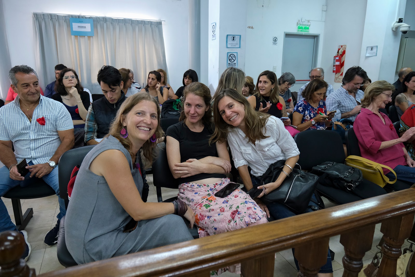 👆 En la espera por el comienzo, en la primera fila y a plena sonrisa. A la derecha María Fernanda Raverta, que es la hija de María Inés Raverta, una de las secuestradas y desaparecidas en Perú, actualmente Ministra de Desarrollo de la Comunidad en la Provincia de Buenos Aires. En el centro, Laura Segarra, hija de Adela y media hermana de Raverta. A la izquierda, Virginia Croatto, asistente habitual al juicio además de querellante y una de las primeras testigos. 📷 Gustavo Molfino/El Diario del Juicio |