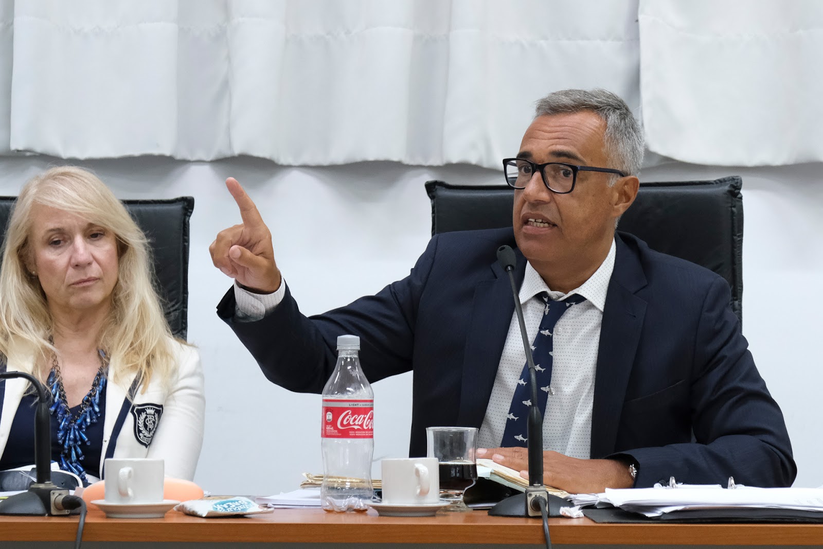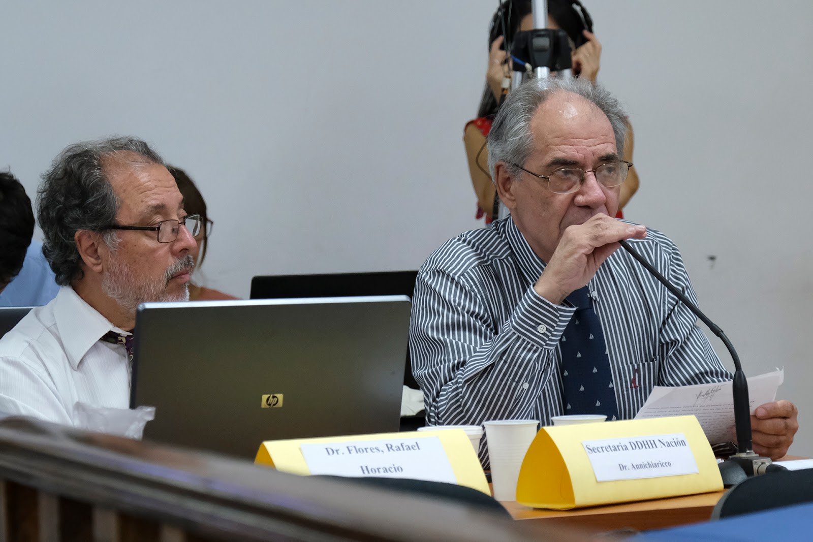 👆 En esta jornada fue muy relevante el rol del abogado Rafael Flores, aquí realizando una pregunta. El de Guadix es el único caso con querella por fuera de la que representa Pablo Llonto. Flores es cuñado de Guadix. Su trabajo, junto al de la Fiscal Gabriela Sosti, fue indagar en las contradicciones permanentes de quienes participantes de aquel sumario de 1980 y que participaron de esta audiencia. Al lado de Flores, el abogado de la Secretaría de Derechos Humanos de la Nación, Ciro Anicchiarico.📷 Gustavo Molfino/El Diario del Juicio |