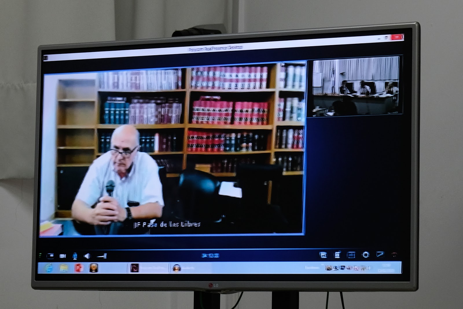 👆 A través de las cámaras, una de las secretarias del juzgado les hizo reconocer fotos, croquis y firmas de viejas declaraciones. En este caso, puede verse la foto del sector aduanero del puente que oficia como frontera entre Uruguayana (Brasil) y Paso de los Libres (Argentina). Otros testimonios, fundamentalmente el de la sobreviviente Silvia Tolchinsky, dan cuenta de que varias personas secuestradas fueron llevadas desde Campo de Mayo hasta ese puesto, con la intención de obligarlos/as a señalar compañeros y compañeras desde la ventana de los vidrios polarizados.📷 Gustavo Molfino/El Diario del Juicio |
