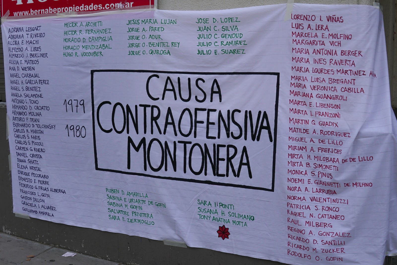 ☝ Foto de portada 👉 Una bandera aparece colgada en la fachada enfrente del tribunal. Tiene todos y cada uno de los nombres de quienes formaron parte de la Contraofensiva y fueron desaparecidos/as. 📷 Diego Guiñazú/El Diario del Juicio