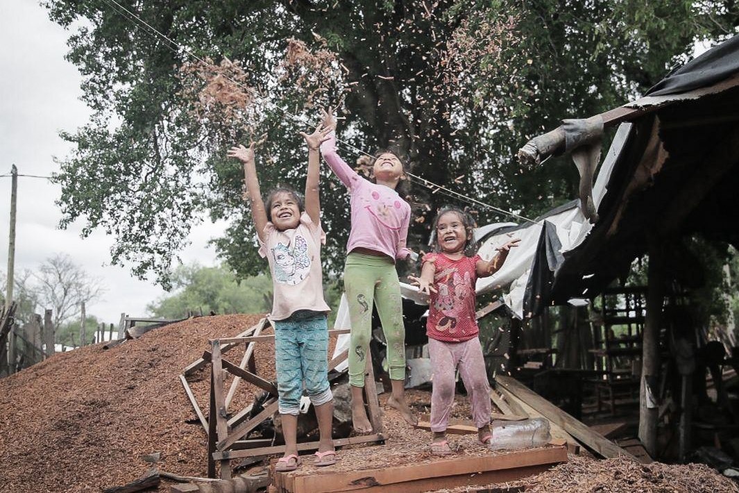 📷 Foto de Portada 👉 Tres niñas wichí sonríen, a pesar de todo. La del medio tiene una malformación atribuible al uso indiscriminado de agrotóxicos en la zona: nació con un solo brazo. (Rodrigo Caballero/La Garganta Poderosa)