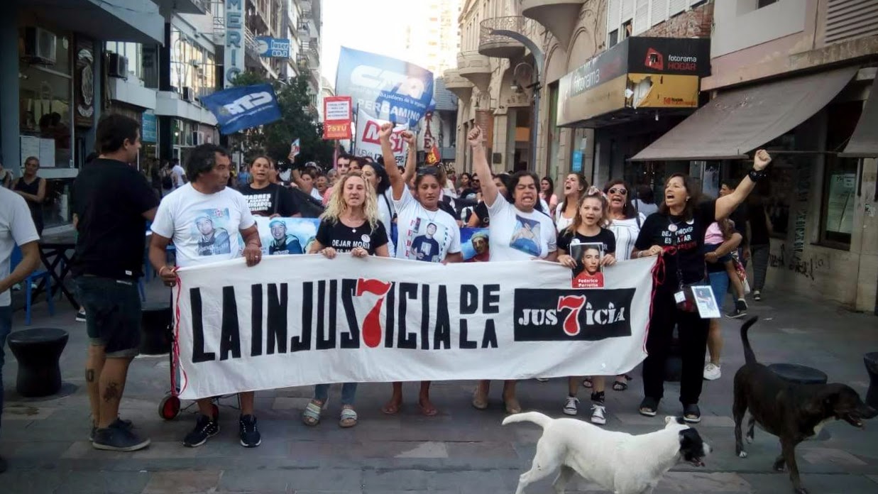La marcha deja atrás algún aplauso, algún «bien, sigan luchando» de algún buen hombre que luego, cuando se lo invita, a marchar, se niega. Pero sobre todo, deja muchas caras de desprecio, de disconformidad: de los habituales «me ensucian la calle» o «no es la manera». La marcha es pacífica y respetuosa: cinco o seis perros jugando son el prólogo de un centenar de personas que viene marchando detrás. Encabezan las madres y padres de los chicos con una bandera que grita: «La injus7icia de la jus7icia». Siempre los 7 reemplazan a cada T, con su color rojo sobre el lógico fondo negro. Una marca que ya se ha instalado entre quienes queremos guardar y contagiar esa memoria. Atrás, y acompañando de ahora en adelante con su fuerza, las Madres de los Barrios Fumigados. Ellas comenzaron a organizarse en asamblea hace un tiempo, y ante el micrófono destacan que seguirán acompañando esta causa porque también son madres y porque hay que acabar con todas las injusticias de una vez y para siempre. De vez en cuando -para callar algún silencio que sobra- las familias aprovechan y vuelven a gritar los nombres de los pibes, cada uno se corona con un rotundo «¡Presente! ¡Ahora y siempre!». Tampoco falta lugar para nombrar a los 6 ex policías, Alberto Sebastián Donza, Alexis Eva, Sergio Rodas, Brian Carrizo, Matías Giulietti y Carolina Guevara, que cumplían servicio aquel 2 de marzo, y que recibieron condenas de entre 6 y los 15 años en el juicio que finalizó el 20 de diciembre del año pasado.