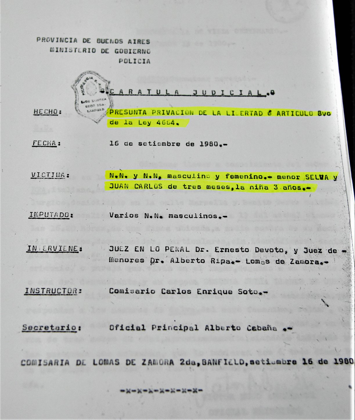 Por si la historia no fuera ya retorcida, Selva busca entre sus papeles y agrega a esta causa una novedad: un expediente judicial del mismo momento de los hechos. José Curra, el esposo de la vecina que los recibió, fue a realizar la denuncia y con ella se generó un expediente en los Tribunales de Lomas de Zamora que Selva tiene allí y del que El Diario del Juicio publica algunas imágenes. “Lo busqué, lo busqué, lo busqué -repite-. Finalmente estaba ahí archivado en los Tribunales de Lomas de Zamora , pero estaba…”. El matrimonio testifica allí que la niña decía llamarse Selva y que su hermano se llamaba Juan Carlos. Certifican además el gran operativo.