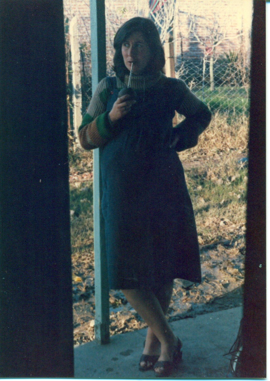 Volvieron en abril del ‘80 y se instalaron en Villa Centenario, Partido de Lomas de Zamora. “Mi recuerdo son calles de tierra, casas prefabricadas; unas cuantitas, muy poquitas. Grandes terrenos baldíos enfrente, alambrados. Se trataba de una zona bastante suburbana”, traza el mapa desde su memoria infantil. Parecen ser los mejores recuerdos. “Ahí sí tengo muchísimos de la vida familiar. De la dulzura de Carlos, de la panza de Nora que seguía creciendo. Ya iba al jardín. Nos encontrábamos con mi abuela siempre en la vía pública por medidas de seguridad. Las fotos refieren todas a esa época, específicamente de la casa; se ve a ella tomando mate y los alambrados con los baldíos atrás, está ya el nacimiento de mi hermano que voy a relatar después”. Mientras reparte las fotos en las que se la ve pequeña y radiante, su hermano permanece serio y atento en la primera fila del público.
