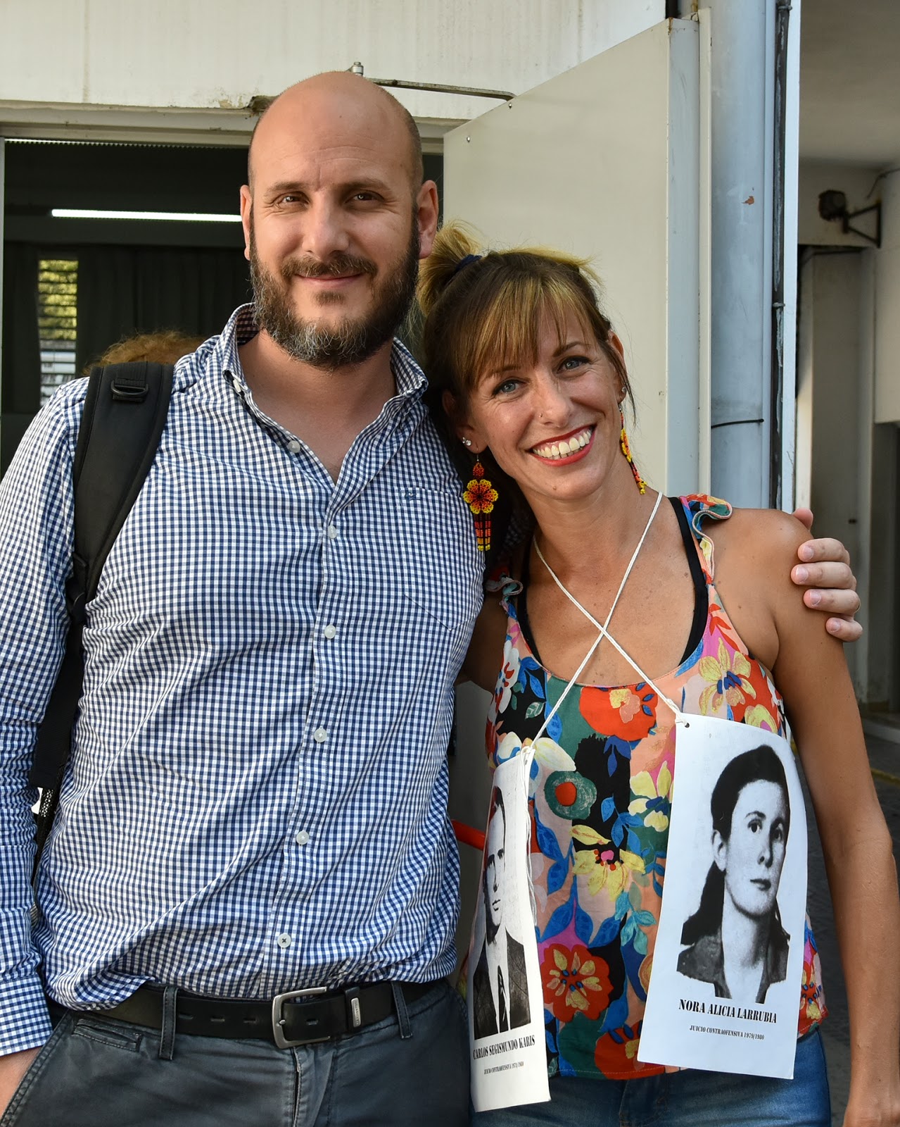 | Varela Istueta con las fotos de sus papá y mamá del corazón como bandoleras, una en cada costado. Aquí se ve a Nora Larrubia. 📷 Gustavo Molfino/El Diario del Juicio |