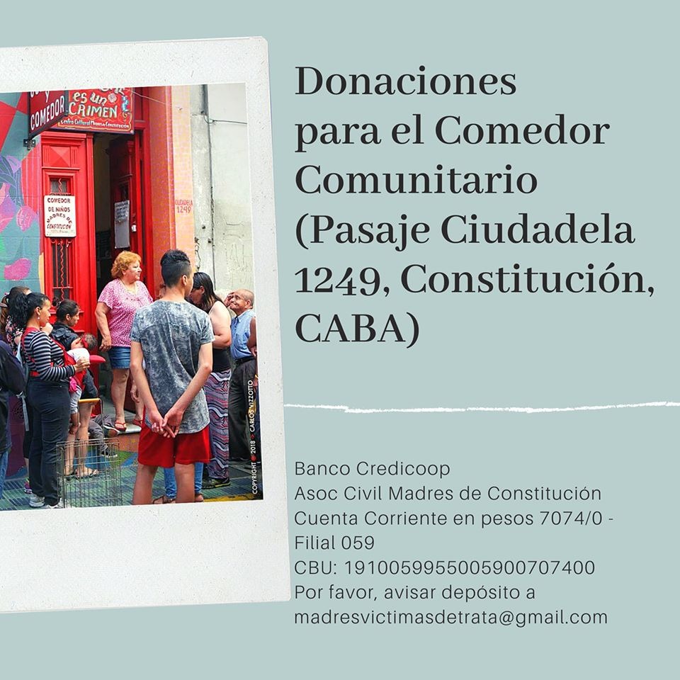 hambre a los vecinos de Constitución a la vez que se combina hábilmente con los fundamentos patriarcales de nuestra sociedad para extraer ganancias de la mercantilización de los cuerpos de nuestras pibas, la caridad de algunos grupos que se dicen feministas no puede parecernos más que una simple fachada. Las Madres Víctimas de Trata saben, las Madres Víctimas de Trata entienden que la entrega de alimentos es fundamental, pero que sola y sin lucha contra las relaciones de poder se reduce a mera desviación del foco de la problemática. Las chicas a las que las madres buscan y las chicas a las que las madres asisten en su salida del Sistema Prostituyente se encuentran en situación de vulnerabilidad durante todo el año, en un confinamiento eterno y obligado, haya o no cuarentena obligatoria y su situación límite, de extrema vulneración no se agota, lamentablemente, con asistencia alimenticia, ni con algún vago dictado de frívolos consejos que parecen burlarse de ellas en la medida en que les sugieren modos irreales y ridículos de “acomodarse” en medio de la vulnerabilidad y la explotación.