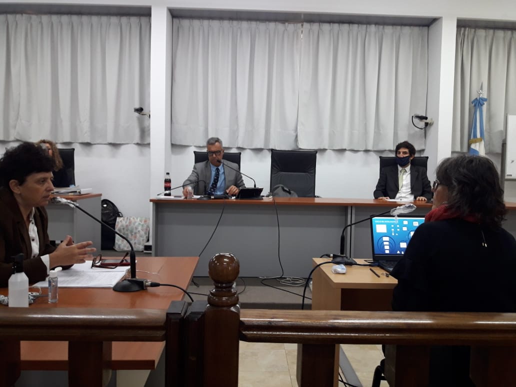 | La fiscal Gabriela Sosti le pregunta a Stella Segado. Las observan los jueces Esteban Rodríguez Eggers y Matías Mancini (con barbijo). 📷 Daniel Cabezas |