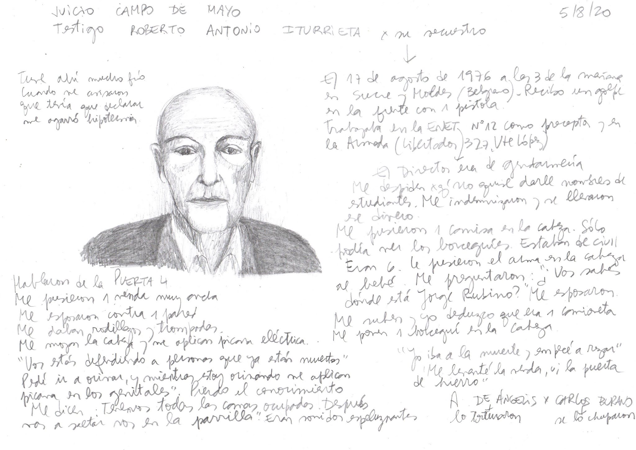 Lo subieron a una camioneta, esposado, y lo llevaron a Campo de Mayo. Durante el interrogatorio lo golpearon y torturaron con picana eléctrica. Él trabajaba en un edificio que la Armada Argentina tenía en Av. Del Libertador y Laprida, en Vicente López. “Me preguntaban por Jorge Rubino, compañero de trabajo en la Armada y también por Carlos Gudano”. Jorge Rubino era oficial montonero de zona norte. “Carlos Alberto Gudano era el contacto con el ERP”, explicó. Fue secuestrado el mismo día que Roberto y permanece desaparecido. “Vos estás defendiendo gente que ya no existe”, le dijeron los torturadores dándole a entender que hablara porque otros ya habían hablado de él. Iturrieta no sabía nada.